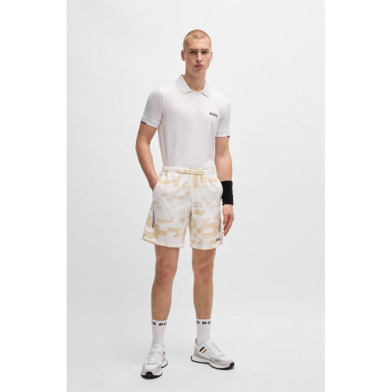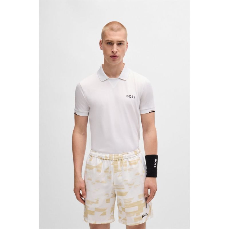 Un polo de malla elástica. Esta prenda de secado rápido presenta detalles de rayas distintivas y está rematada con un inserto en forma de V. Forma parte de la colección Boss x Matteo Berrettini, cocreada por el tenista profesional italiano.