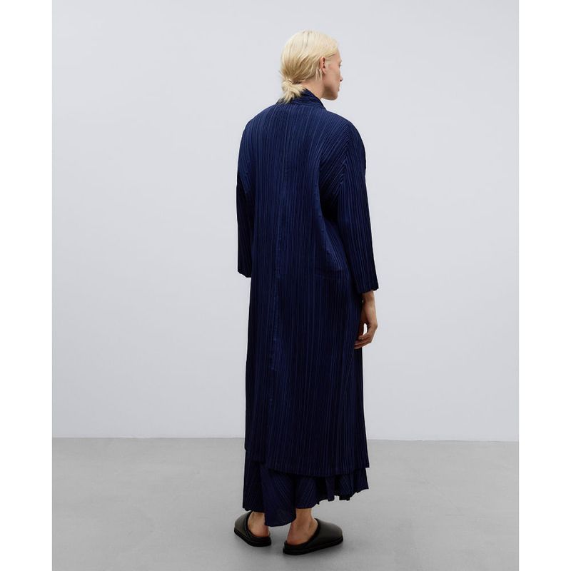 Chaqueta larga en crinkle azul marino mujer. Manga larga. Cuello solapa. Cierre con botonadura frontal oculta. Composición:poliester 100%