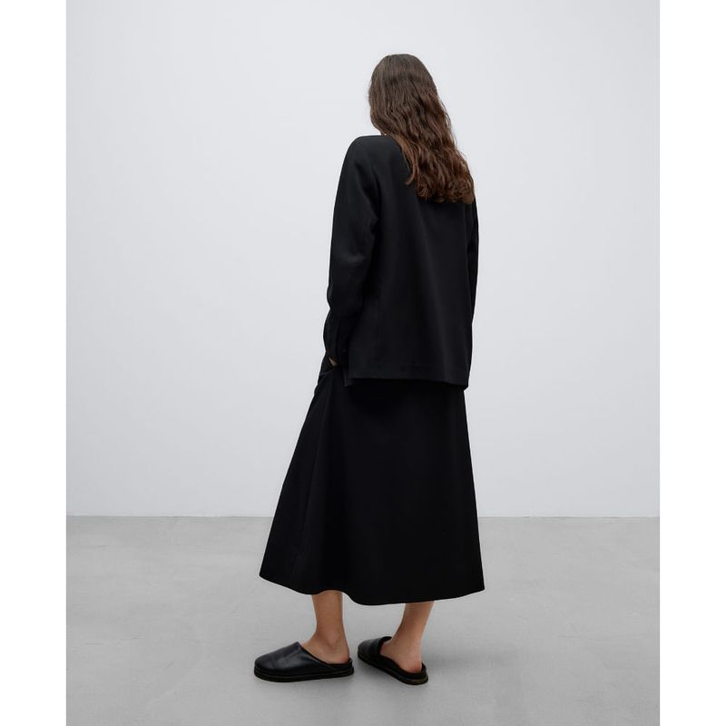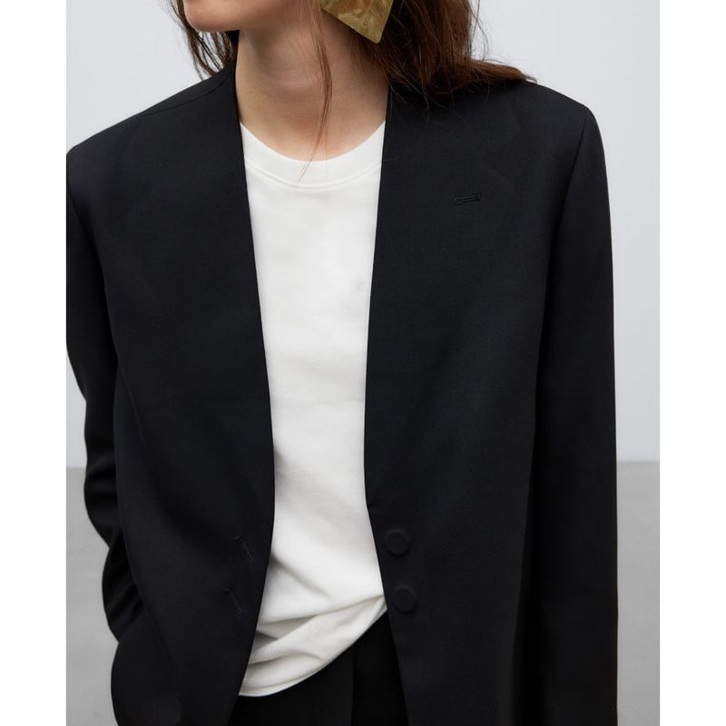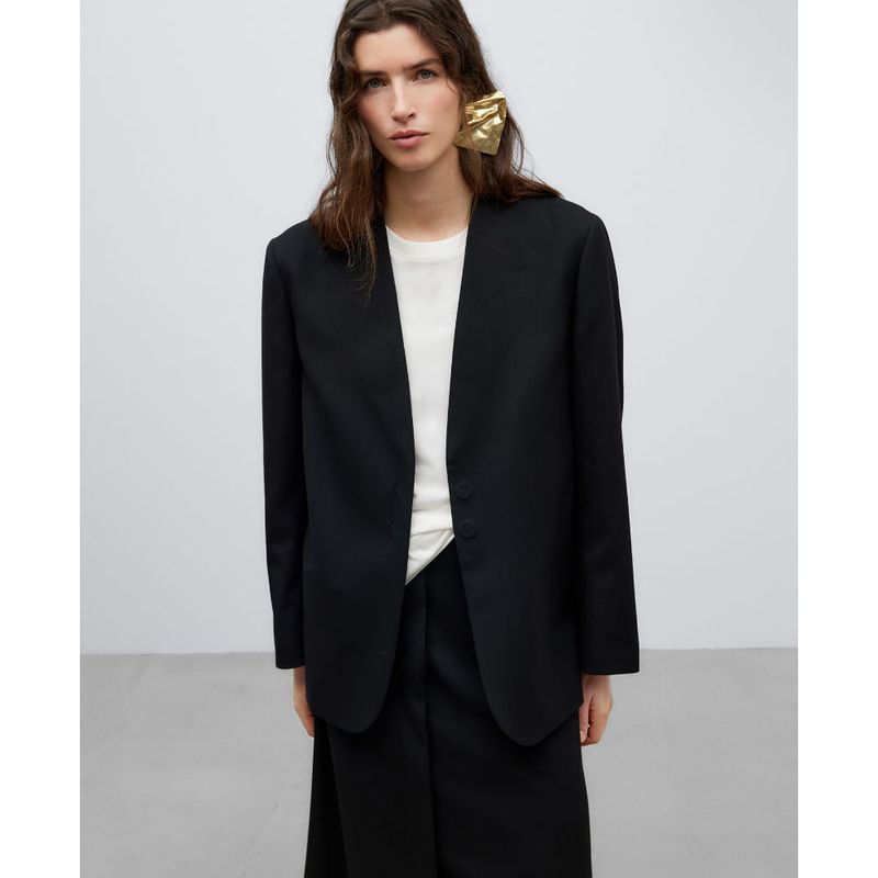 Blazer sastre negro tejido lana merino mujer. Sin solapa. Sin bolsillos. Largo bajo cadera. Efecto emboss. Medio forro. Composición:exterior : poliester 59% lana merino 27% viscosa 14% cuerpo : poliester 57% viscosa 43% , mangas : poliester 100%