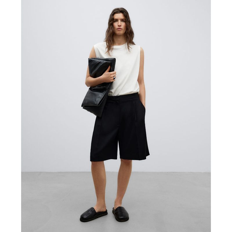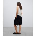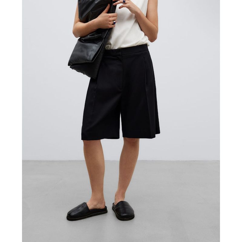 Bermudas negras tejido lana mujer. Pinzas delanteras. Cintura interior de sastrería con sistema de ceñidores y goma para dos posiciones. Bolsillos en los costados. Bolsillo exterior en espalda con efecto embossing. Composición:poliester 59% lana merino 27% viscosa 14%