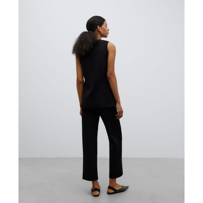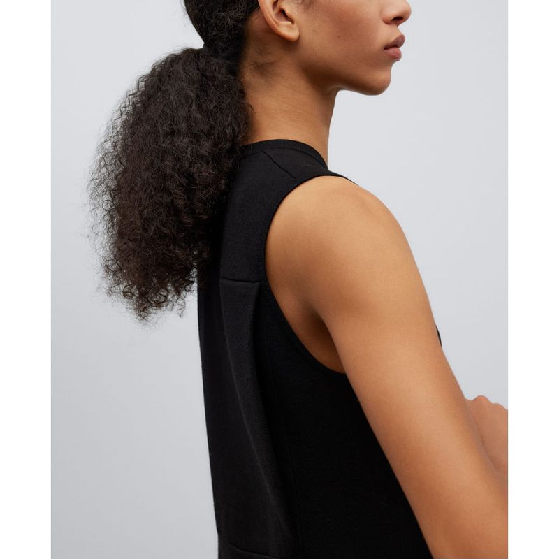 Top en punto doble frontura negro mujer. Línea semientallada. Pliegue en espalda. Cuello perkins. Manga sisa. Composición:viscosa 58% poliester 27% poliamida 15%