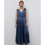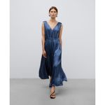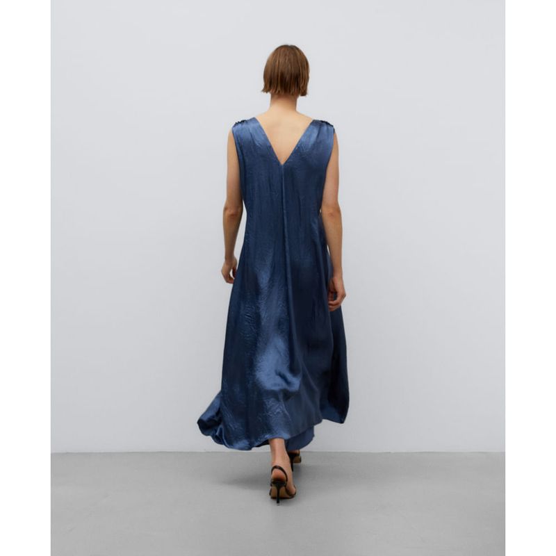 Vestido midi azul mujer. Sin mangas. Escote pico en delantero y espalda. Hombros fruncidos. Cinturón en espalda. Composición:acetato 100%