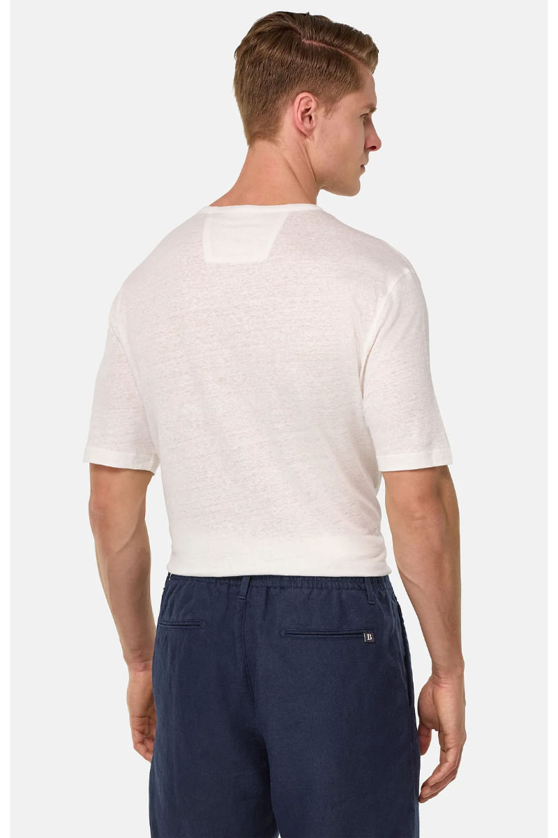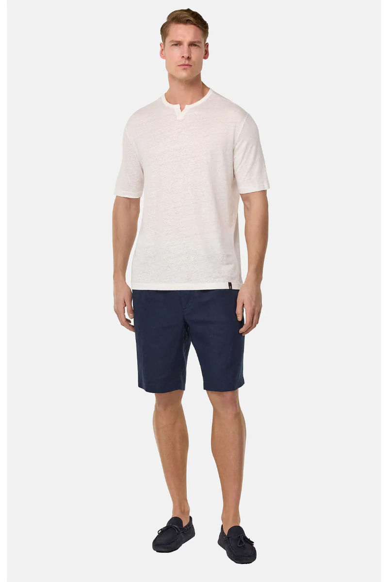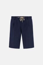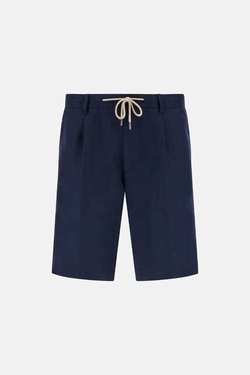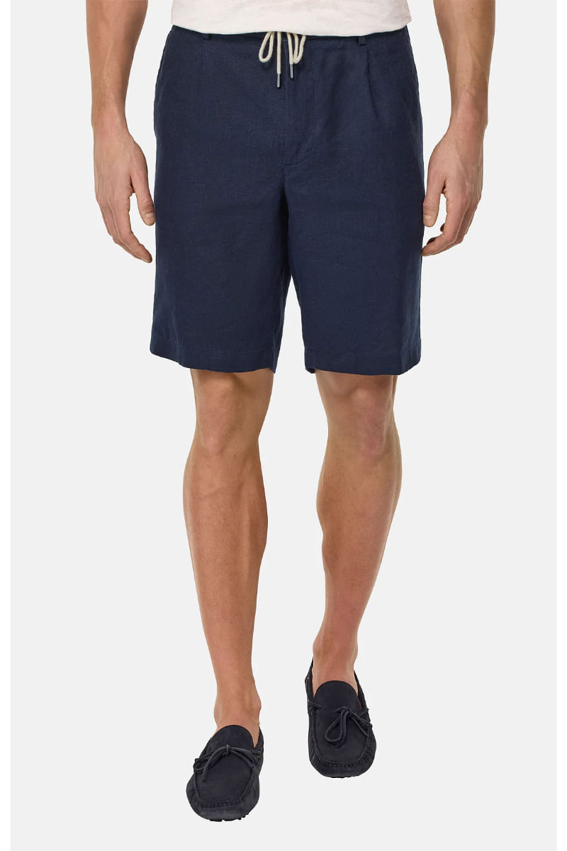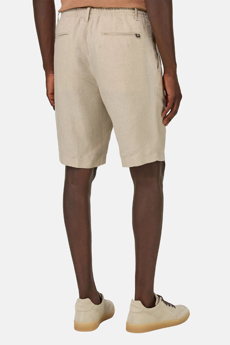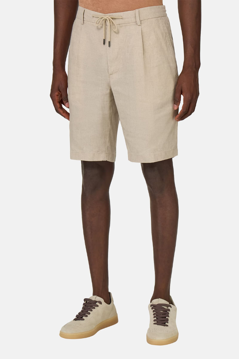 Bermudas de lino liso. Detalle de cordón. Cierre de cremallera con botón, bolsillos diagonales delanteros y traseros. Etiqueta B de Boggi insertada bajo el ribete del bolsillo trasero derecho.