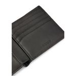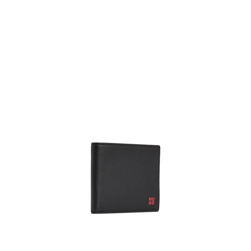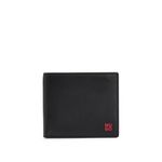 Una moderna billetera plegable con logotipo estampado apilado en rojo, diseñada en piel de napa.
