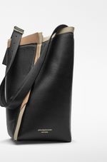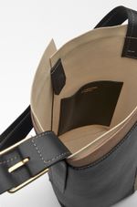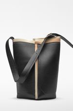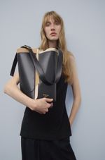 Bolso Renacer Lab (01) en piel y serraje mujer. Un compartimento. Cierre magnético. Asa larga regulable con hebilla metálica. Pespuntes decorativos a contraste. Recortes irregulares que sobresalen de las costuras. Logo grabado. Hecho en España.