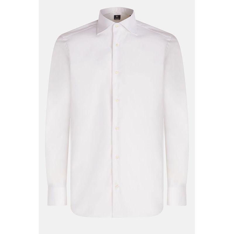 Camisa con cuello Windsor. Confeccionada en algodón elástico de doble torsión. El acabado al que se somete el tejido garantiza la resistencia a las arrugas y la facilidad de mantenimiento.