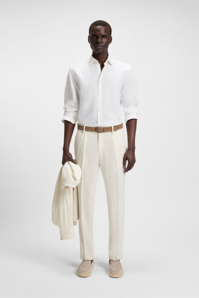 Esta camisa de favorecedor corte recto y con cuello italiano es un básico business para el verano. Mezcla de lino refrescante para mayor comodidad.