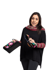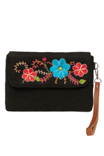Cartera de mano estilo vanite en material de fieltro, con broches de cierre en la tapa, forrada en su interior con tela suave, co bordados de flores ayacuchana en la tapa del vanite y asa de cuero Este estilo de bolso, puede utilizarse con un vestido casual y/o elegante en caso el evento no sea 100% formal, ademas de usarse con ropa ejecutiva o casual