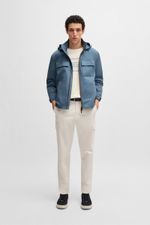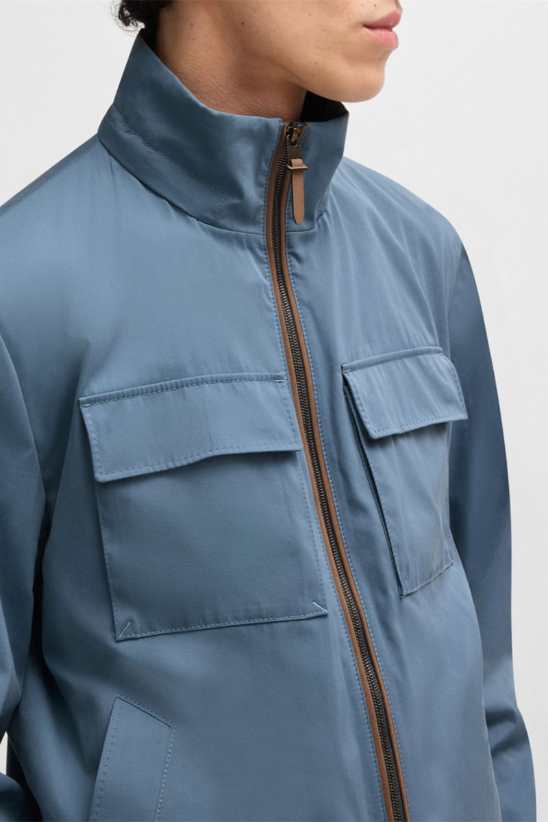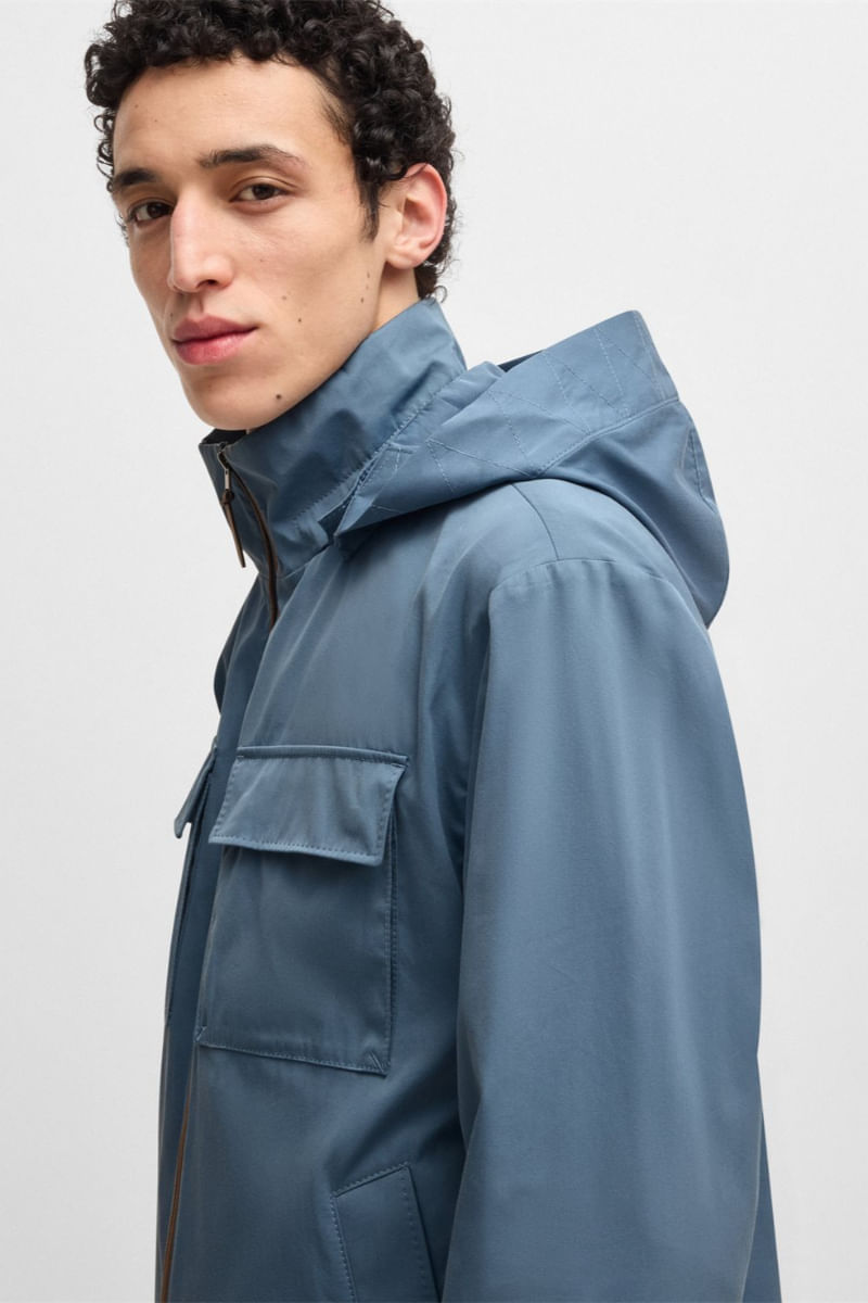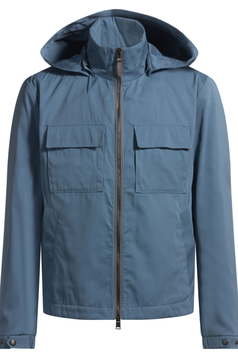 Esta casaca regular fit con capucha es ideal para vestir a capas y está confeccionada en sarga de algodón y seda de la máxima calidad. Versátil cremallera bidireccional. Bolsillos con solapa.