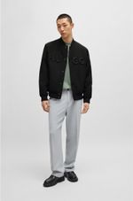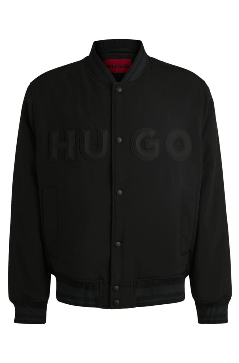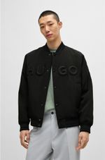 Casaca modelo Bomber impermeable. Esta prenda tiene un corte holgado y un logotipo de goma en la parte delantera.