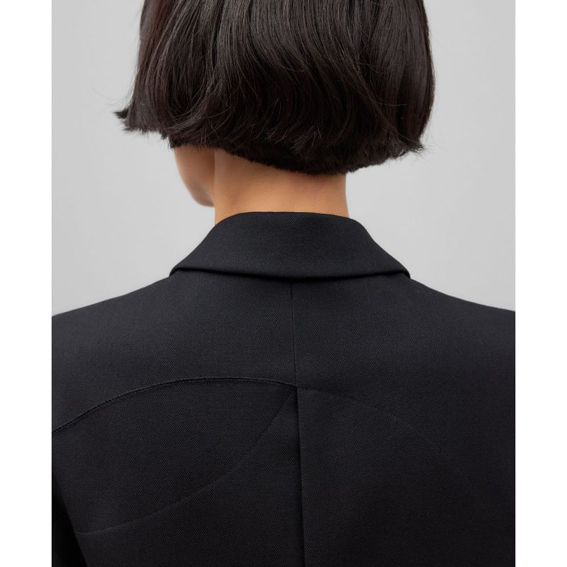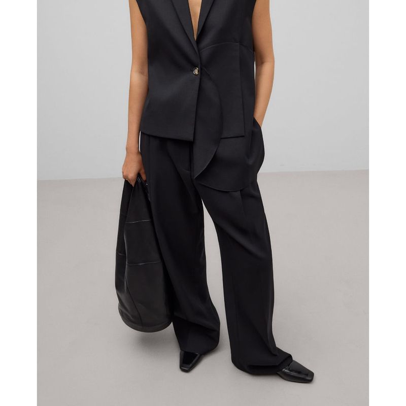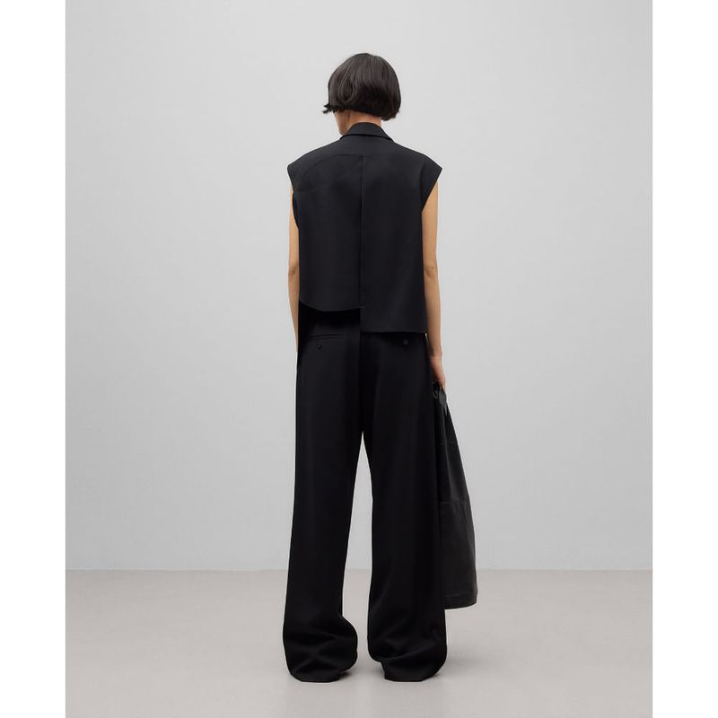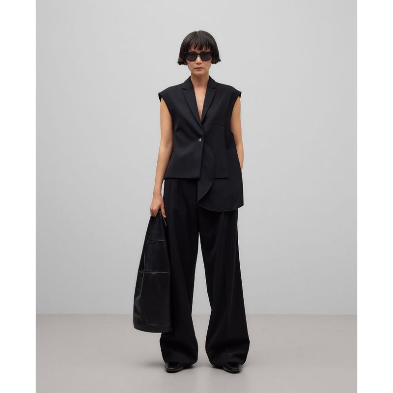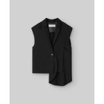 Chaleco asimétrico negro mujer. Cuello solapa. Cierre un botón. Estructura basada en la combinación de círculos superpuestos de distintos tamaños. Composicion General: exterior : poliester 59% lana merino 27% viscosa 14%;forro : poliester 57% viscosa 43%
