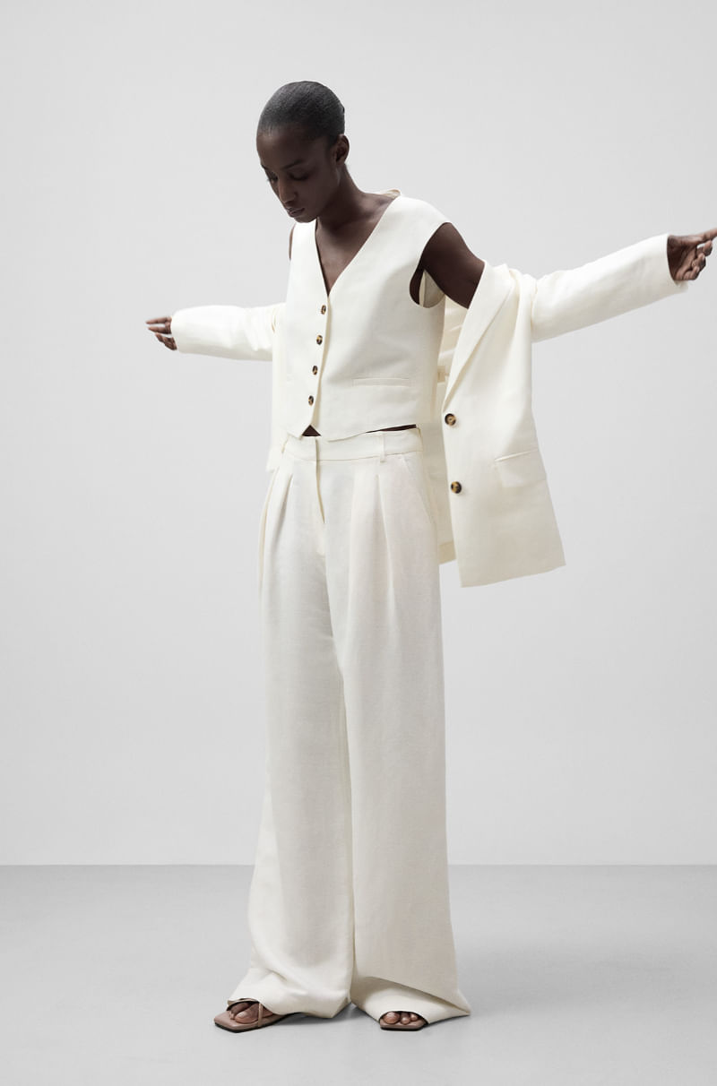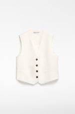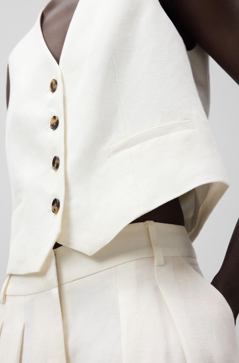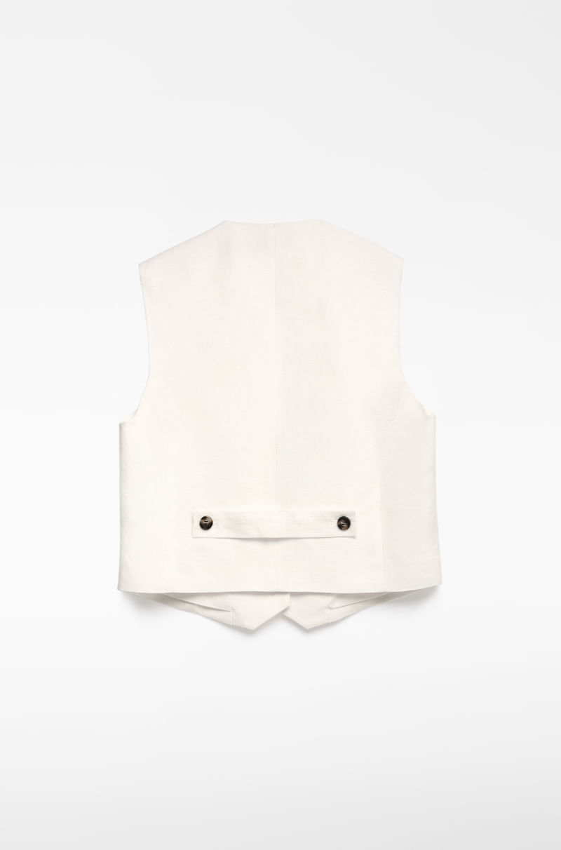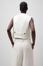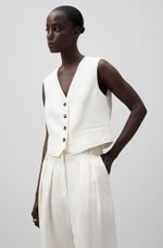 Chaleco sastre corto lino europeo y viscosa responsable mujer. Escote pico. Manga sisa. Botonadura frontal. Bolsillos de vivo en delantero. Pieza ceñidora con dos botones en espalda.