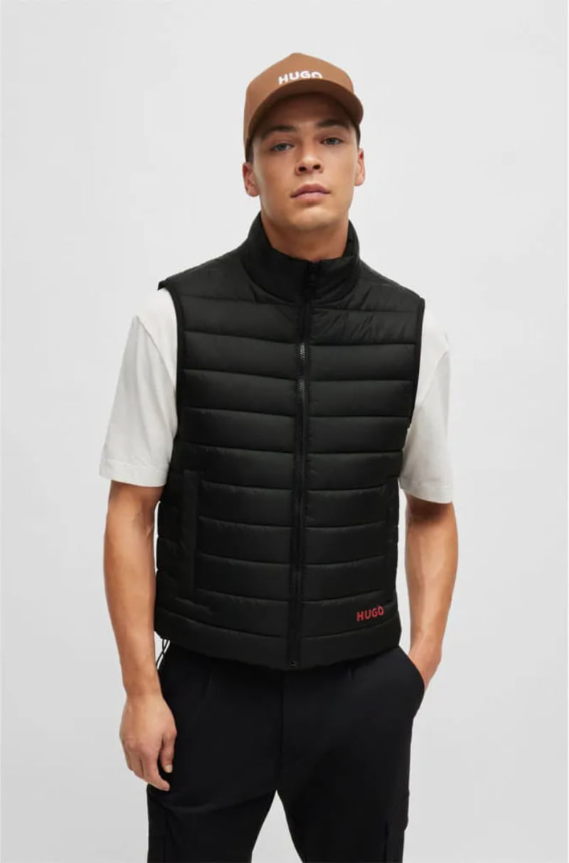 Chaleco slim de HUGO confeccionado en un material repelente al agua. Esta prenda ligera tiene el detalle de la marca en el dobladillo. Este producto está elaborado con poliamida reciclada procedente de residuos textiles pre y pos consumo o de redes de pesca industriales.