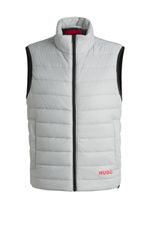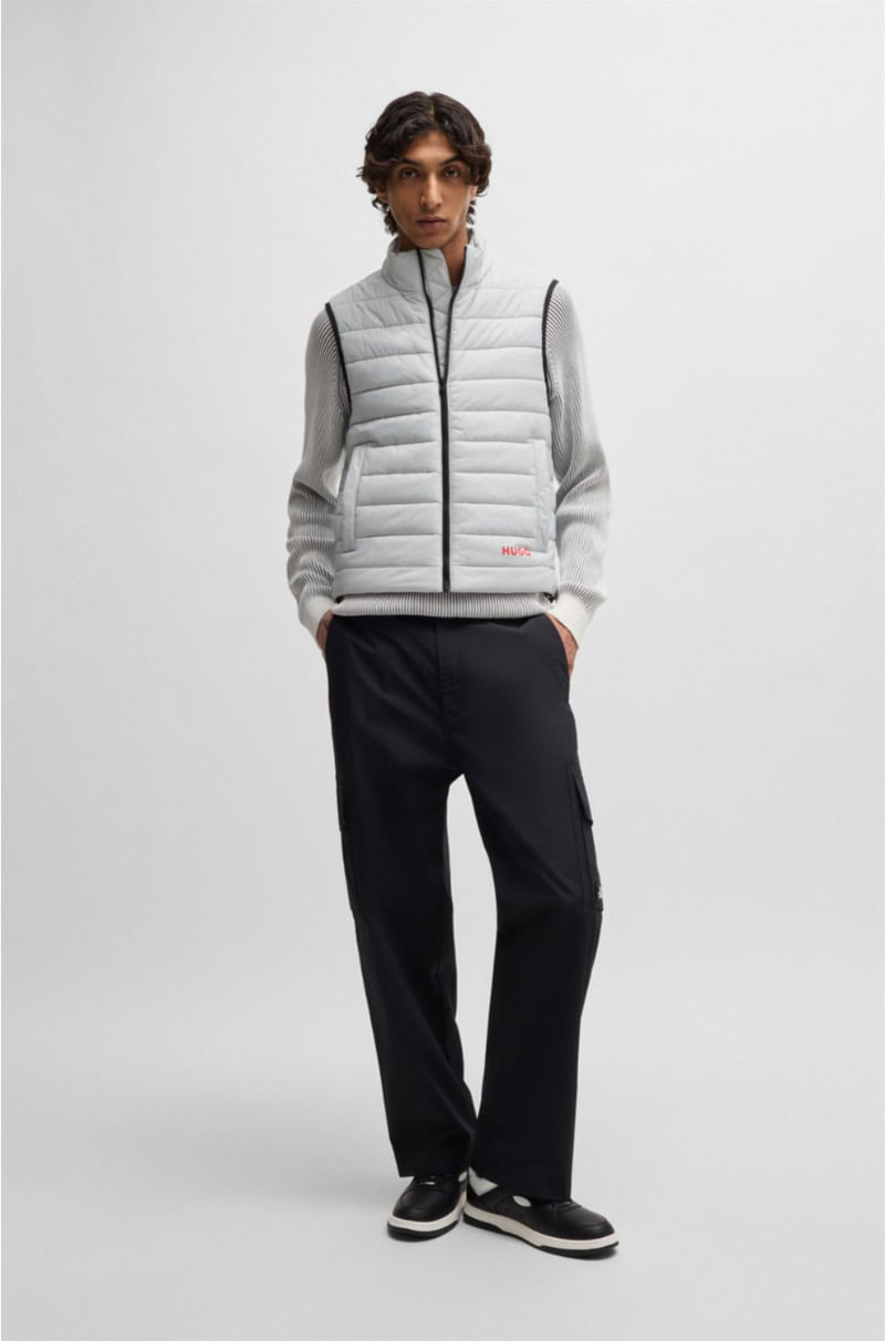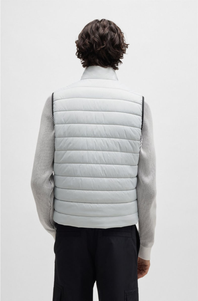 Chaleco slim en tejido repelente al agua. Esta ligera prenda luce la marca en el bajo. Está confeccionado con poliamida reciclada, procedente de residuos textiles pre-consumo y posconsumo o de redes de pesca industrial. El objetivo del uso de materiales r