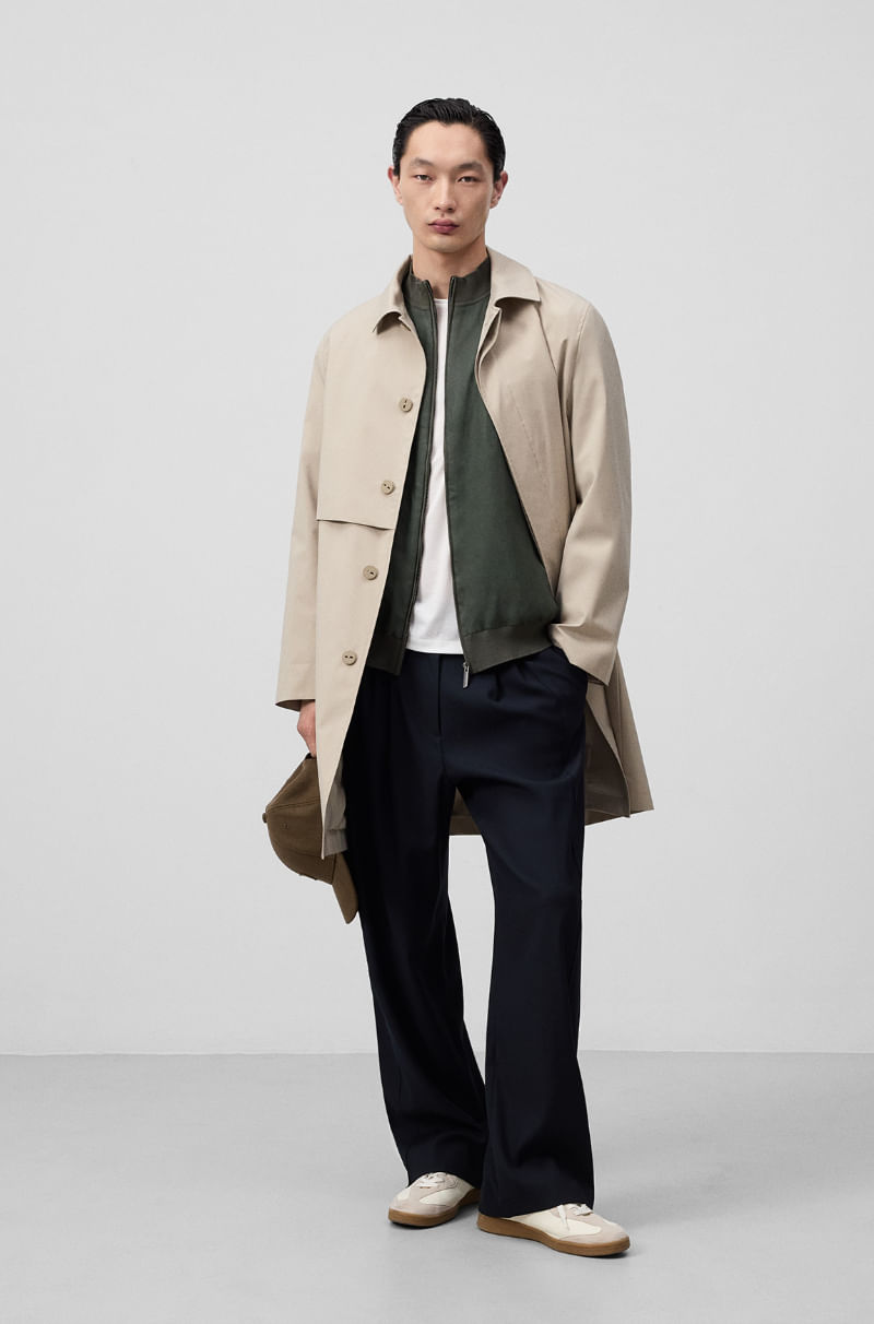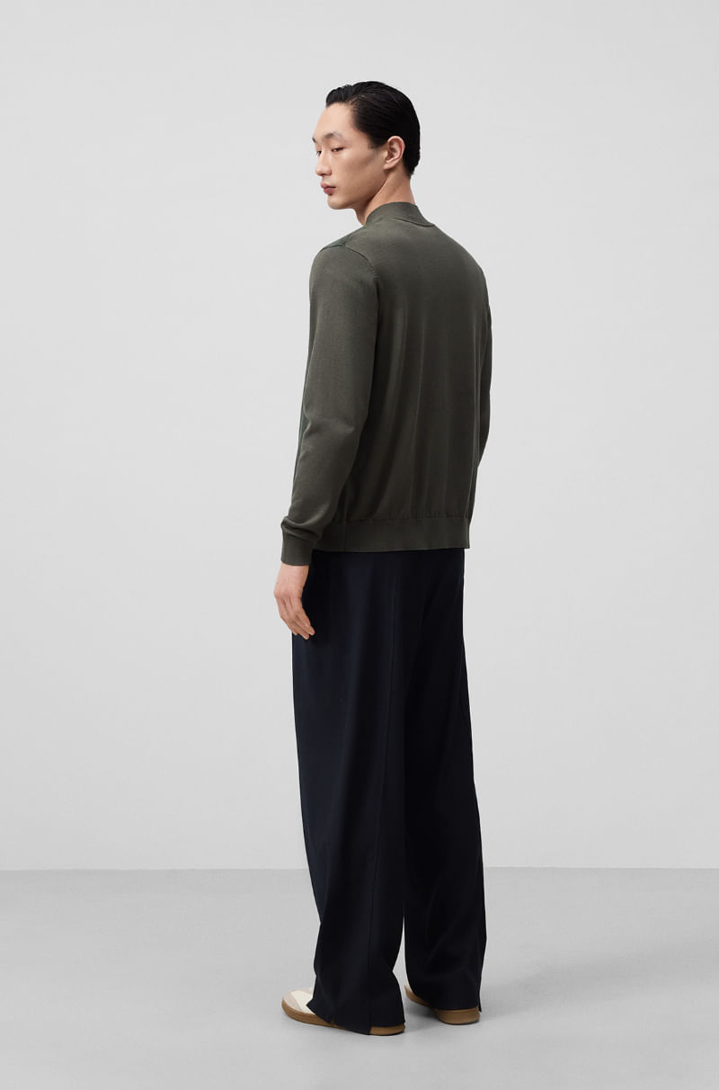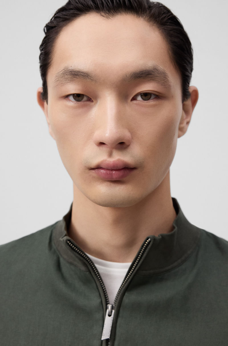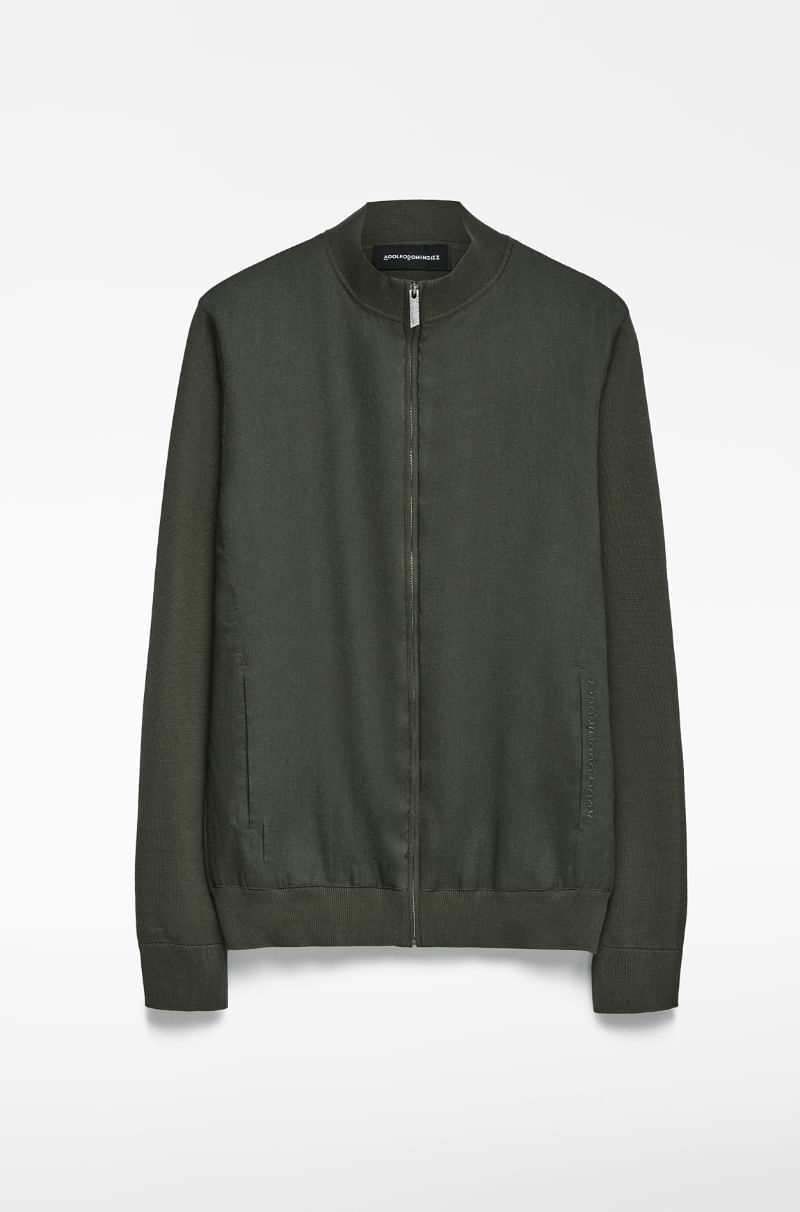 Chaqueta regular fit hombre. Delantero en lino. Manga larga. Cuello tira. Cierre cremallera frontal. Bolsillos en delantero con vivo de lino. Logo bordado en la boca del bolsillo izquierdo.