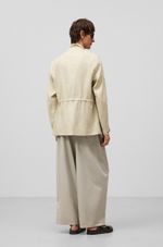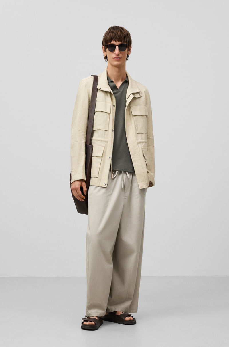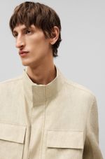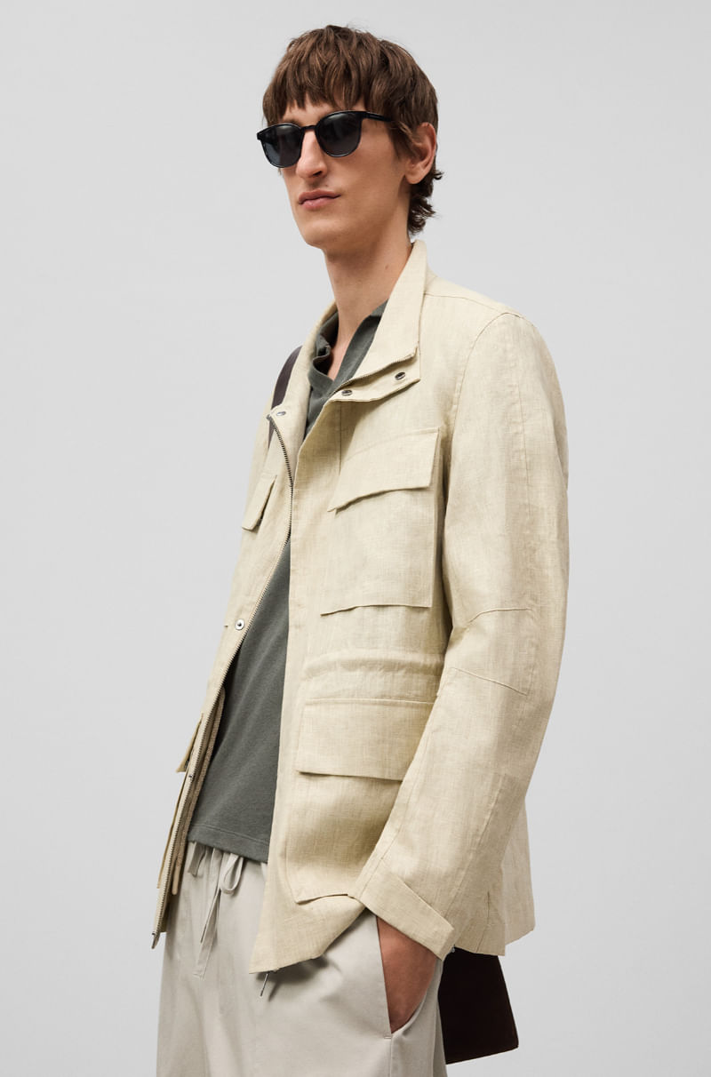 Chaqueta sahariana lino europeo engomado hombre. Manga larga con pinzas en codo. Costura de hombro adelantada. Cuello tira. Cierre cremallera frontal y snaps. Bolsillos de fuelle en delantero.