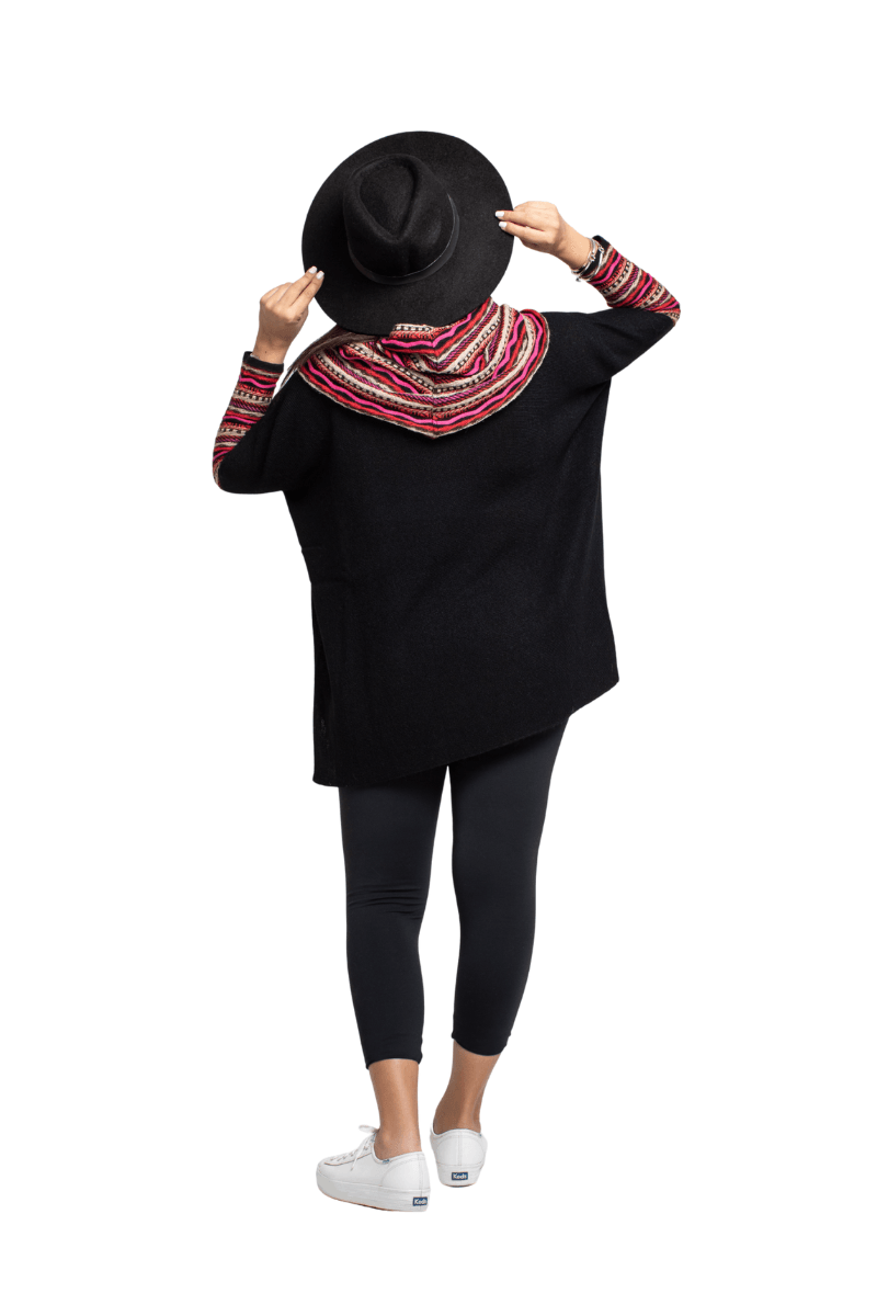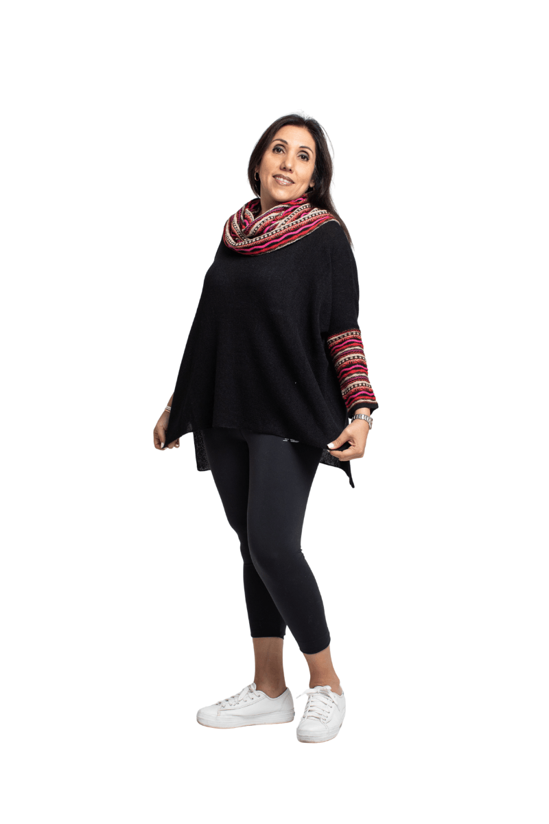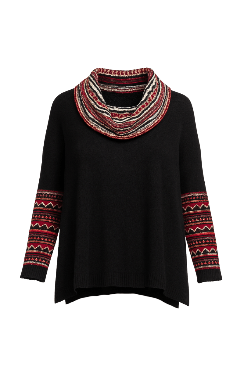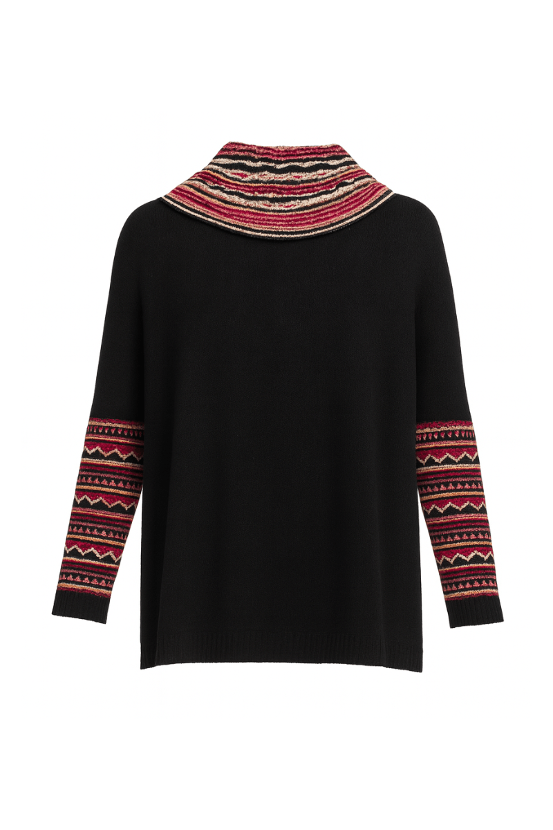 Chompa estilo oversize con cuellera y mangas multicolor con textura ligera Este es un estilo de sweater que puede ser utilizado con falda ejecutiva a la rodilla, jeans, pantalones formales y casuales.