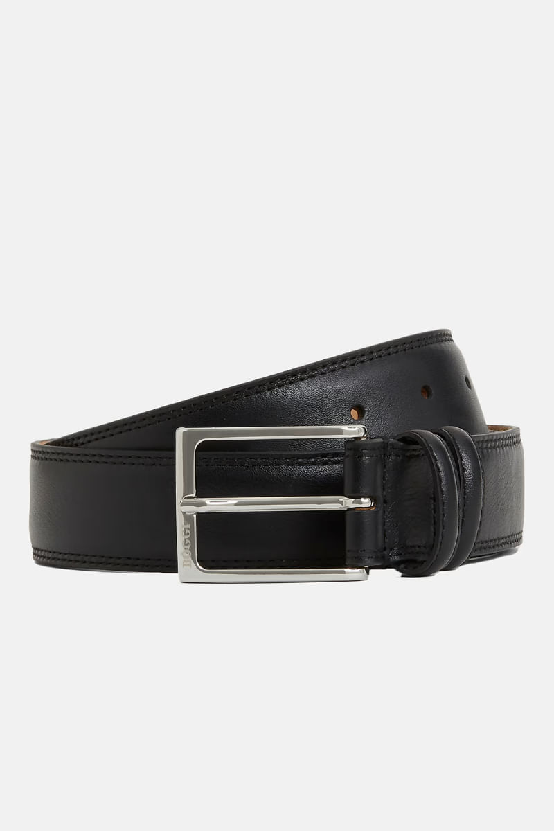 Correa de piel de becerro mate con doble costura con hebilla brillante con logotipo. Ancho de la correa: 35 mm.