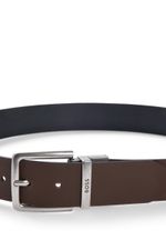 Este correa de 4 cm de ancho incluye una trabilla con detalle de la marca y ofrece dos looks en uno. Elija entre piel negra granulada y acabado liso en marrón.