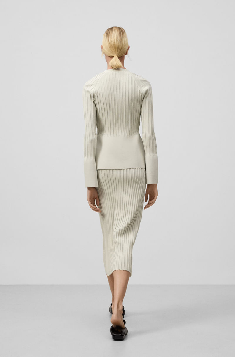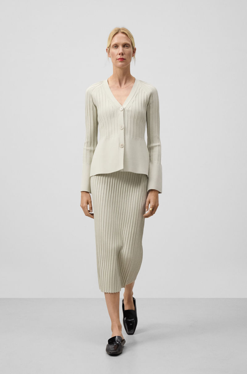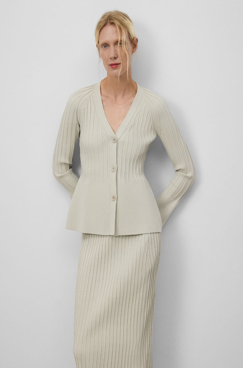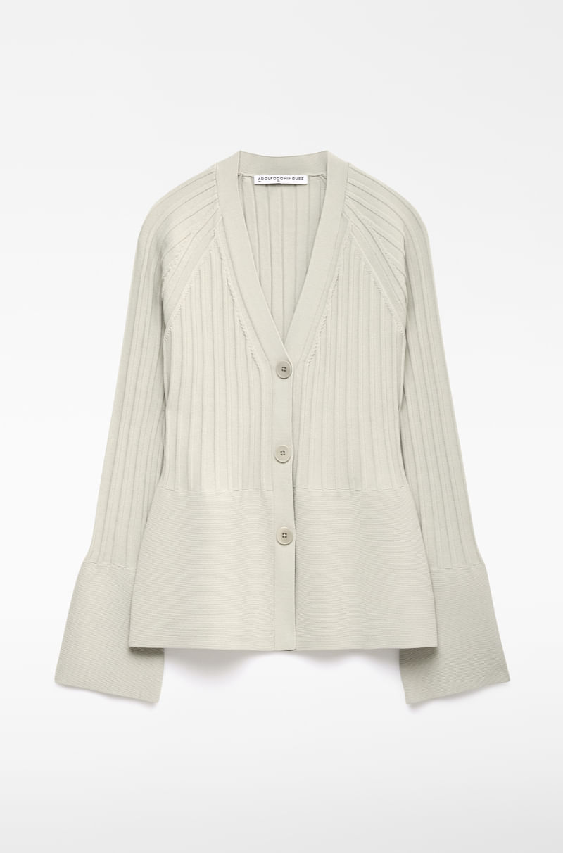Cárdigan peplum canalé mujer. Cuello pico. Manga acampanada. Botonadura frontal.