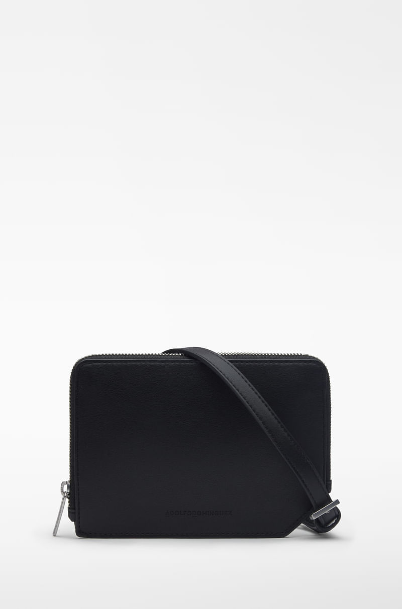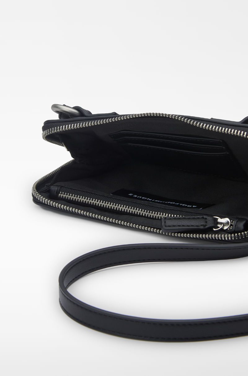 Crossbody Piel No Piel negro hombre. Corte diagonal en esquina inferior. Un compartimento. Cierre cremallera. Bolsillo interior con cierre cremallera. Tarjetero interior. Asa larga regulable con hebilla metálica. Logo grabado.