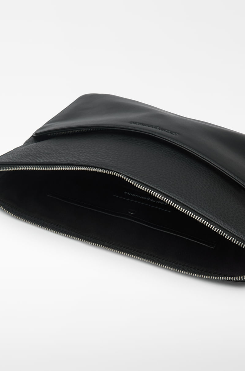 Funda portátil piel responsable negra hombre. Textura grano y textura lisa. Un compartimento. Cierre cremallera. Bolsillo exterior con cierre cremallera. Logo grabado.