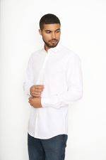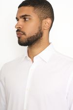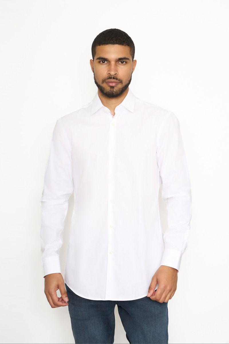 Una camisa slim fit confeccionada en popelín de algodón con un acabado de planchado fácil y con detalles de tejido en contraste en el interior.