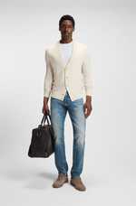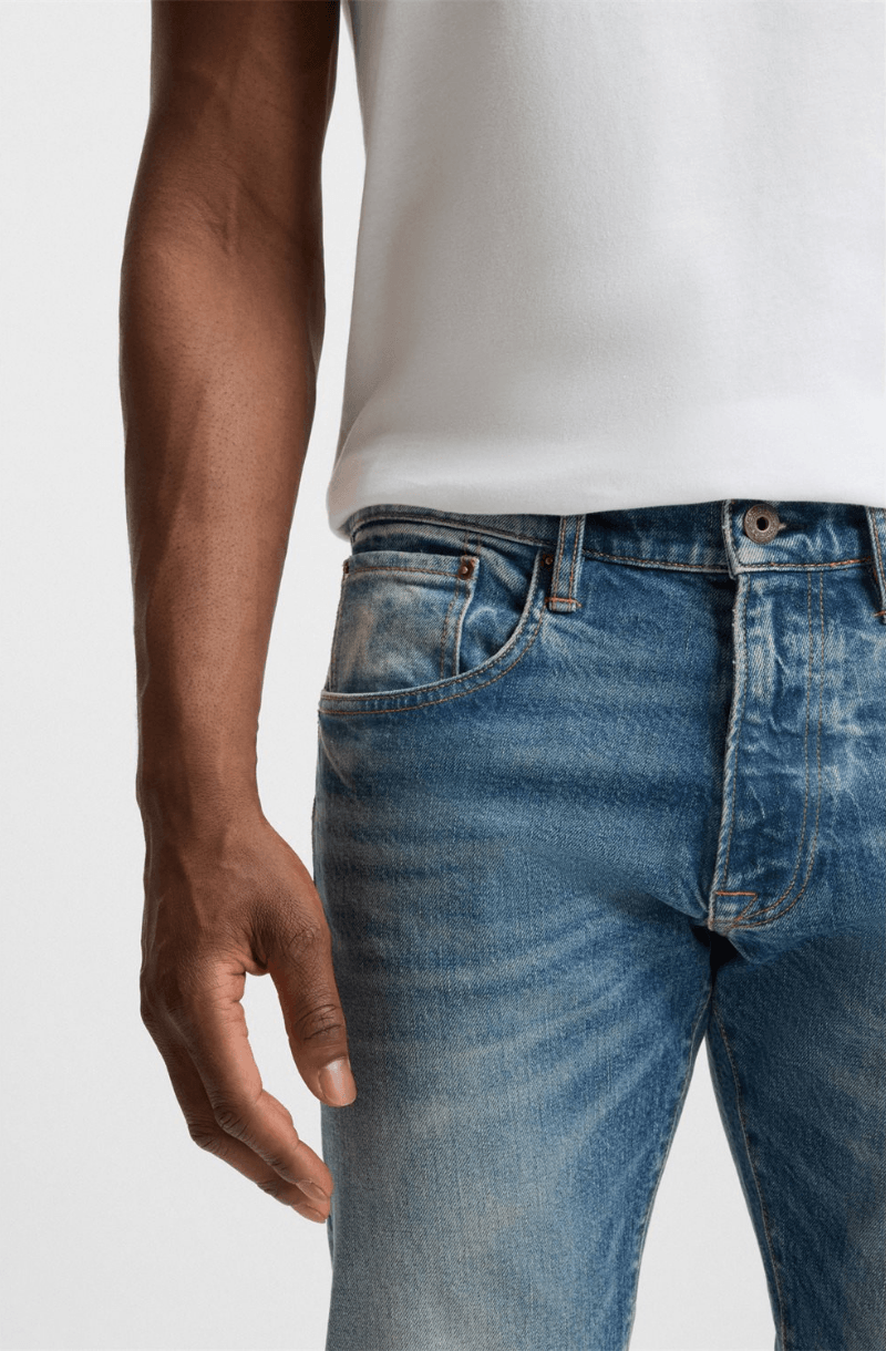 Estos jeans BECKHAM x BOSS, confeccionados en tejido elástico azul con lavado vintage, son un clásico discreto. Elegante corte slim fit. BECKHAM x BOSS aporta un estilo sencillo con prendas clave atemporales y sofisticadas inspiradas en el armario de Davi
