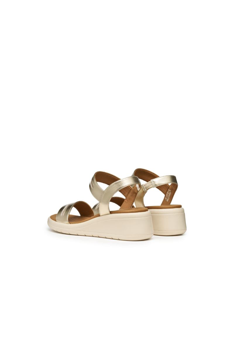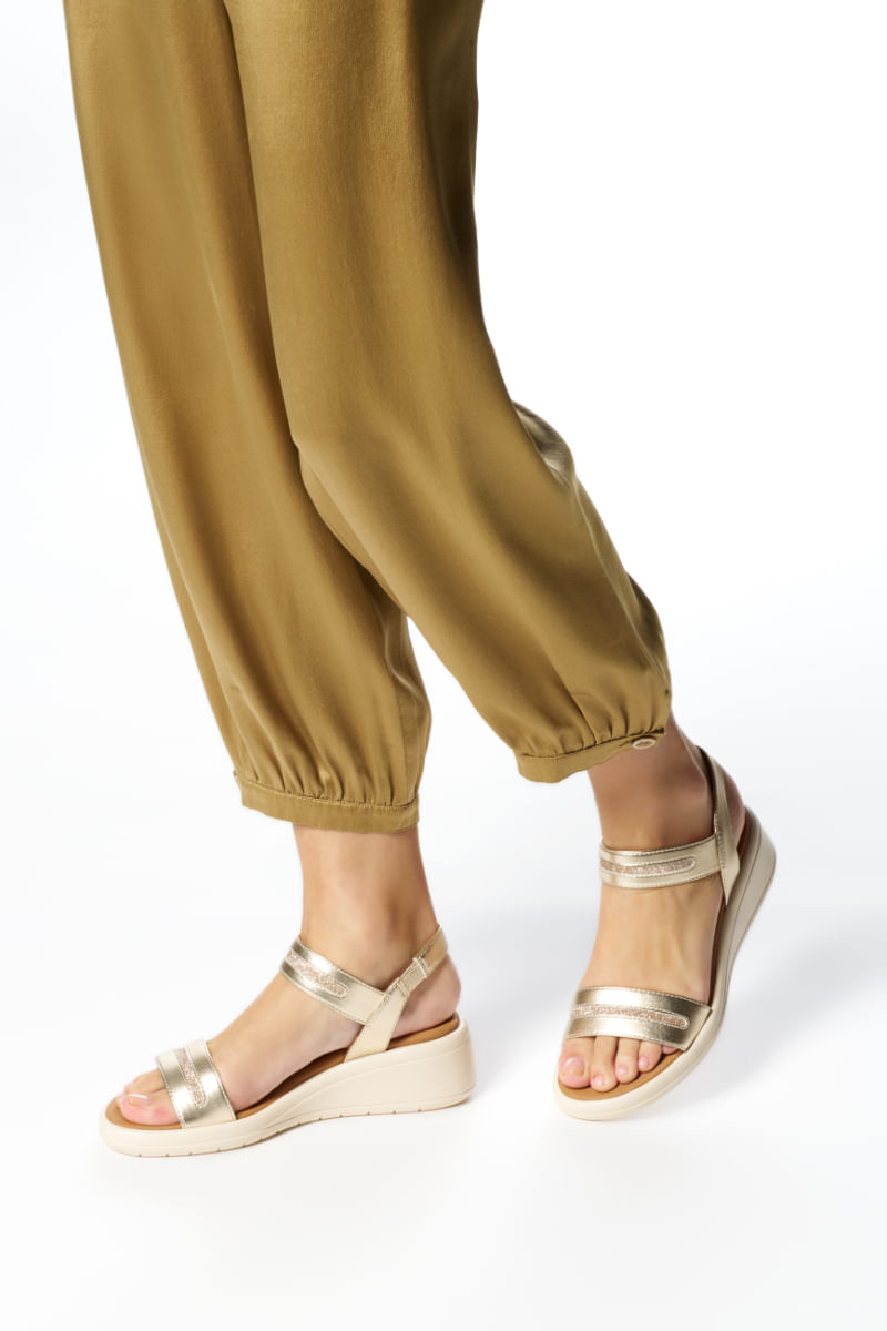 Meliconia es una sandalia de mujer con una cuña absolutamente versátil e informal, apta para diario, que ofrece confort y transpirabilidad. Realizado en material efecto piel metalizada con detalles de tejido con purpurina, este modelo añade un toque espec