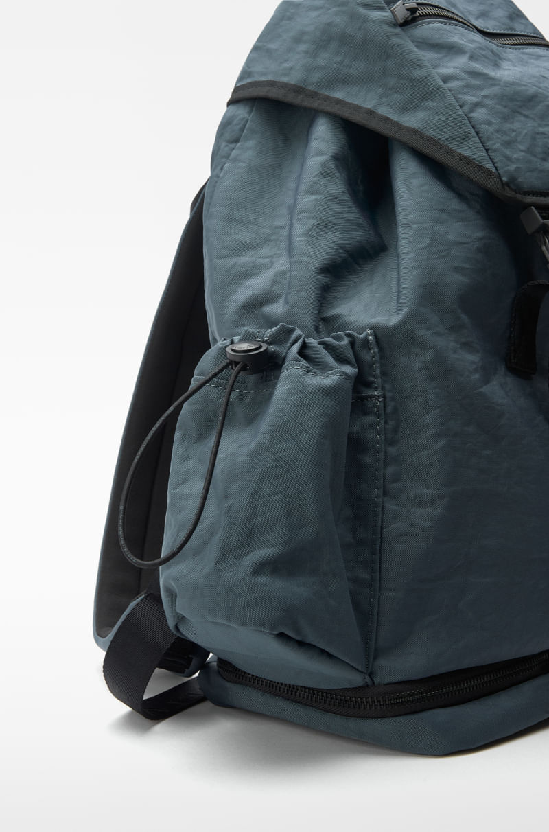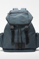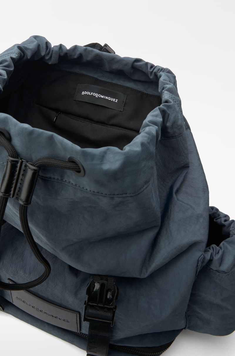 Mochila saco nailon reciclado hombre. Un compartimento. Cierre con cordones en la parte superior. Bolsillo exterior con cremallera. Bolsillos laterales para botella con ajuste de cordón y estrangulador. Tapa con forma trapezoidal cerrada con dos hebillas.