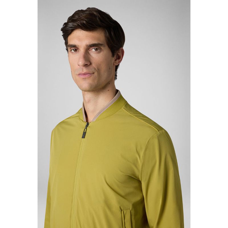 Práctica y deportiva, la casaca modelo bomber soft shell con bandas en contraste. Cierre delantero con cremallera, bolsillos laterales de ojal y dobladillo y puños de punto.