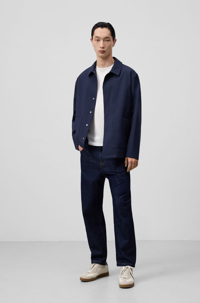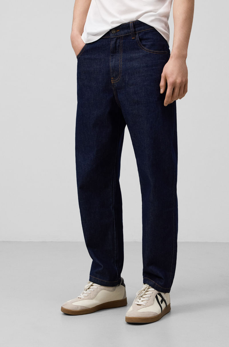 Pantalón denim carrot fit hombre. Cierre botón metálico. Trabillas. Cinco bolsillos. Pespunte decorativo a contraste.