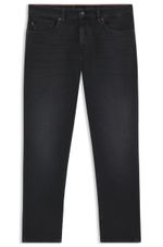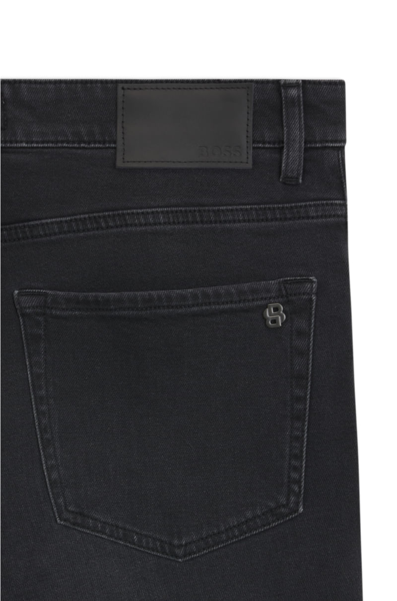 Pantalón jeans de corte cónico en denim negro elástico y cómodo.