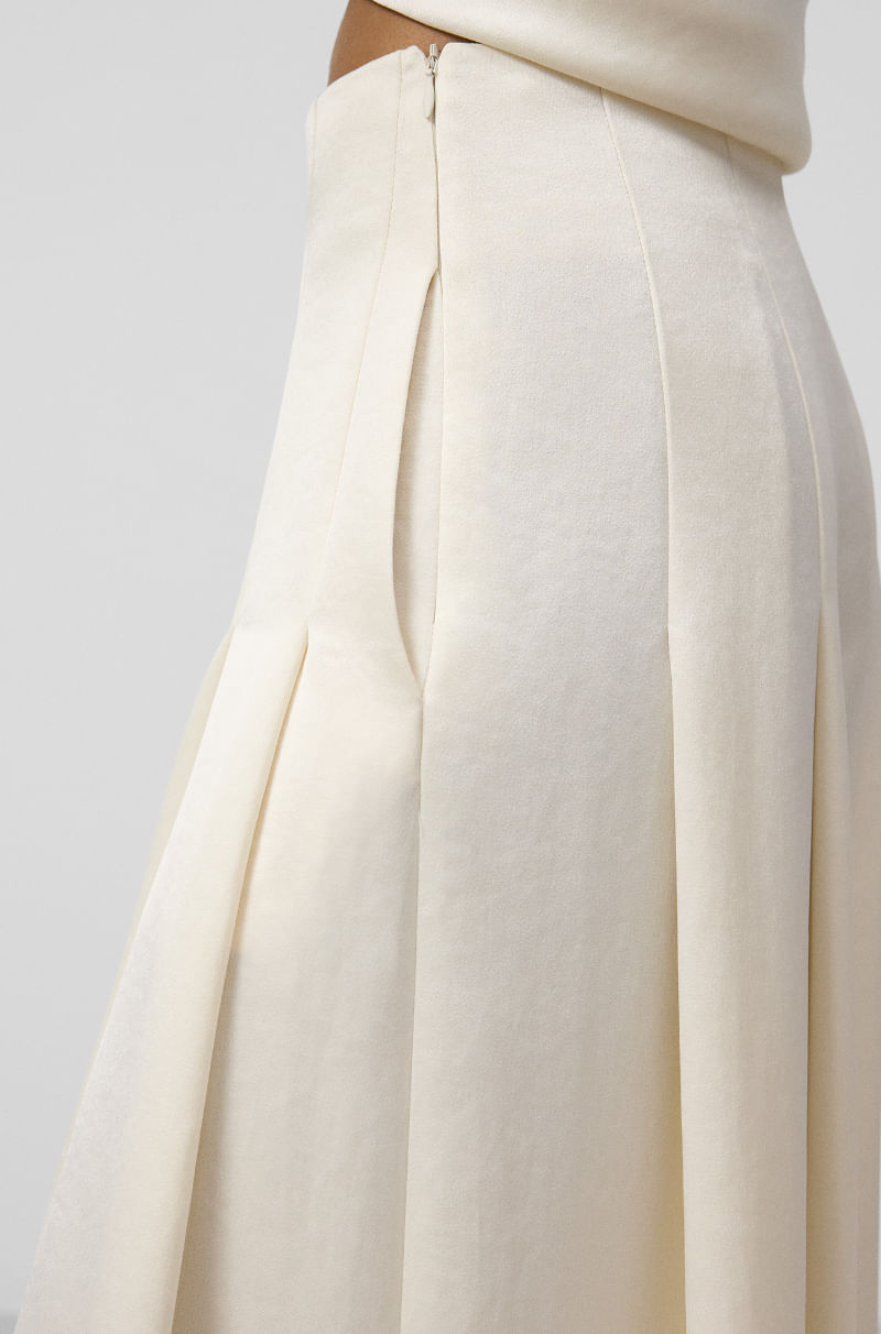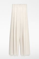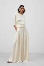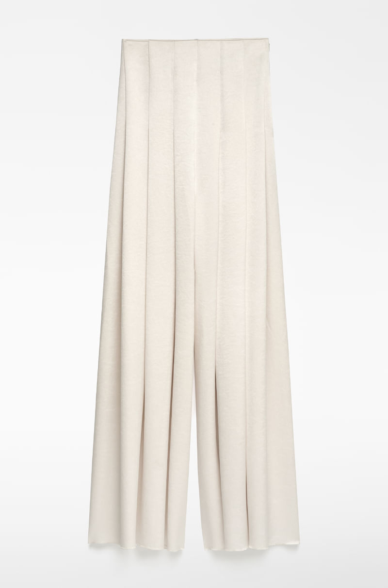 Pantalón satinado mujer. Tiro alto. Pierna ancha con maxi tablones. Cierre cremallera lateral.
