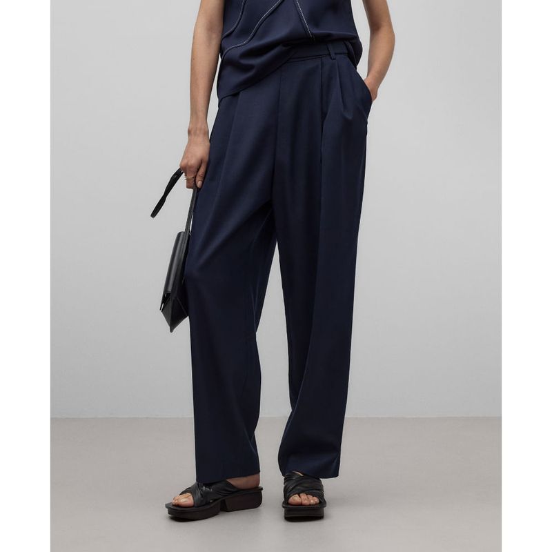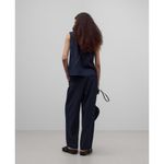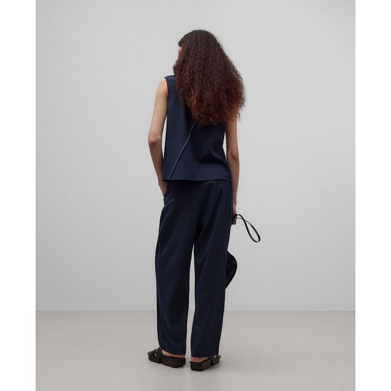 Pantalón sastre azul marino mujer. Trabillas. Pinzas en delantero. Cierre botón en espalda. Bolsillos laterales. Bolsillos de vivo en espalda. Pespunte decorativo a contraste en lateral de la pierna. Pierna recta. poliester 80% viscosa 19% elastano 1%