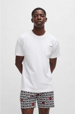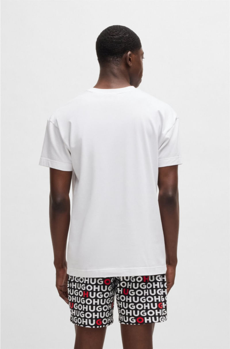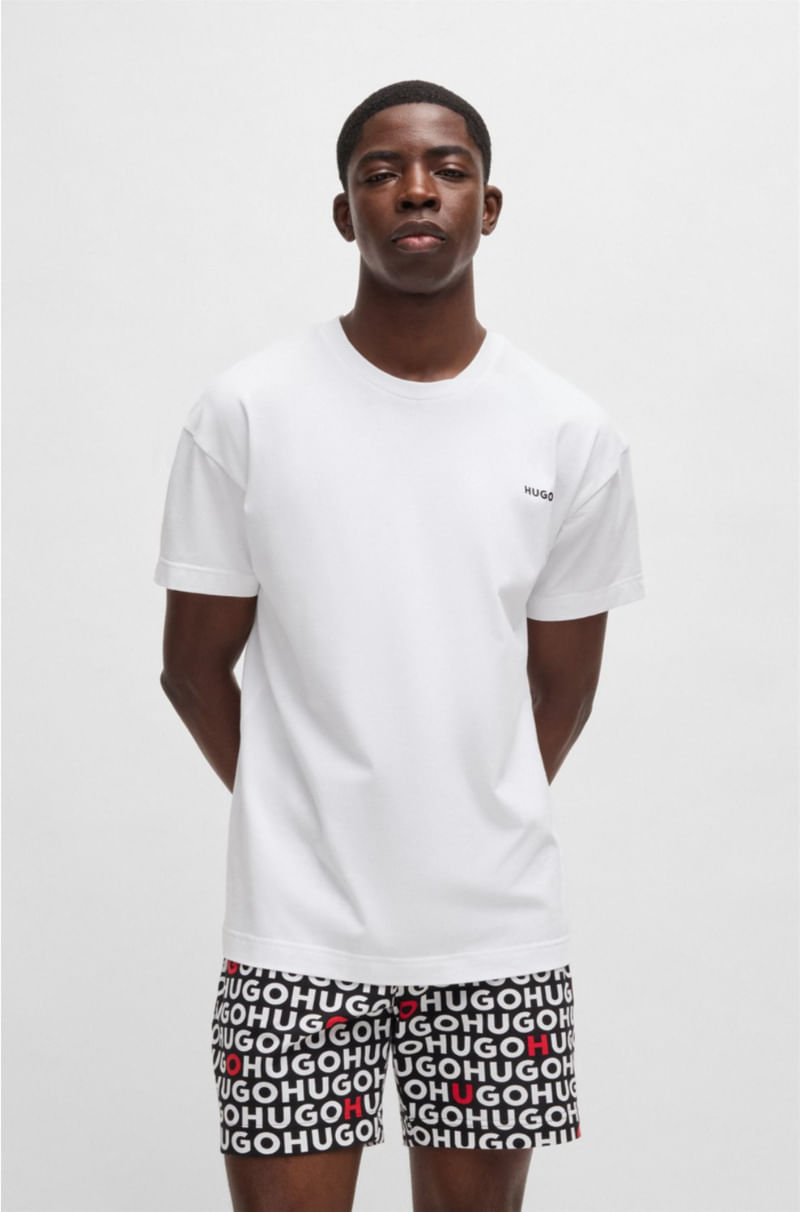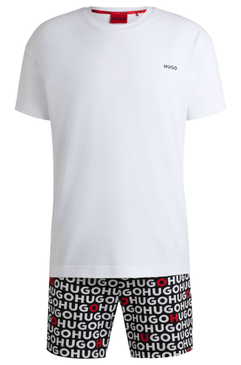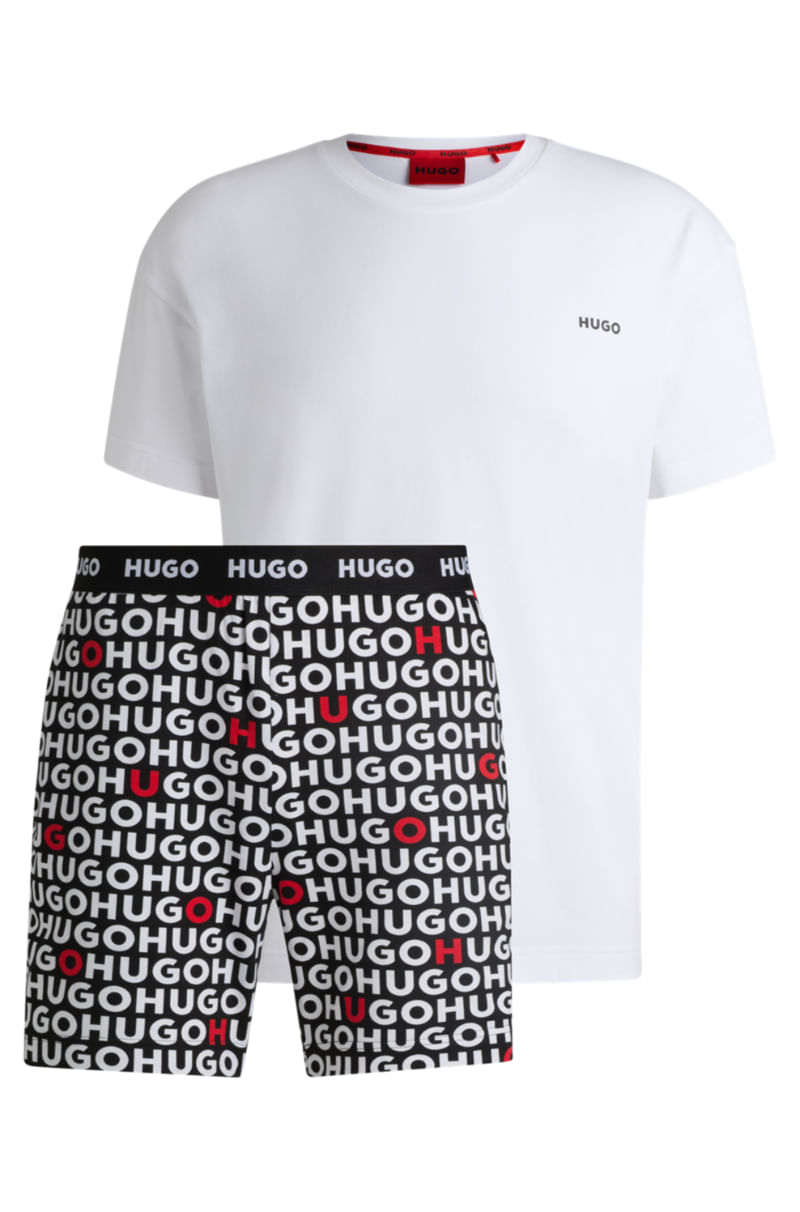 Pijama exclusivo, presentado en una caja de regalo. Este conjunto distintivo incluye una camiseta con el logotipo estampado y pantalones cortos con la marca repetida.