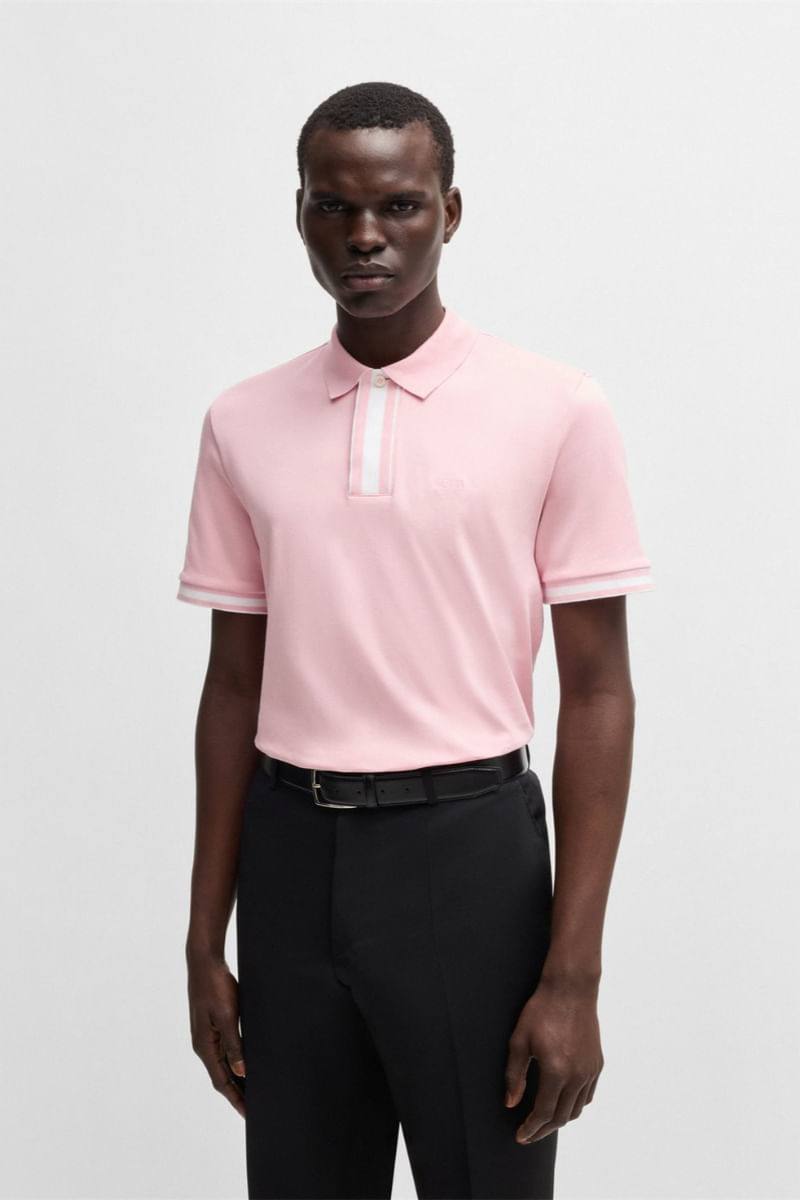 Un polo regular fit de manga corta. Este moderno polo con extremos a rayas de colores está elaborado en tejido interlock de puro algodón para mayor comodidad. El logo estampado BOSS completa el diseño de la prenda.