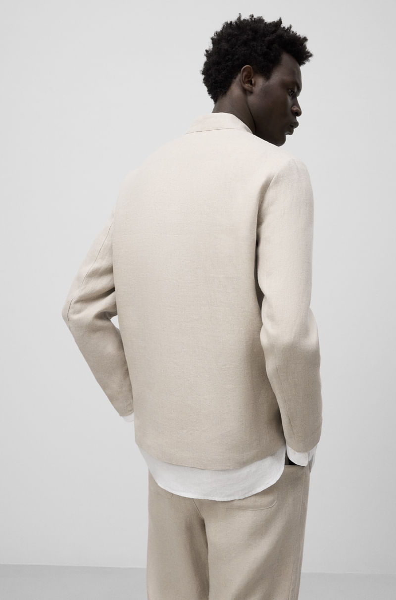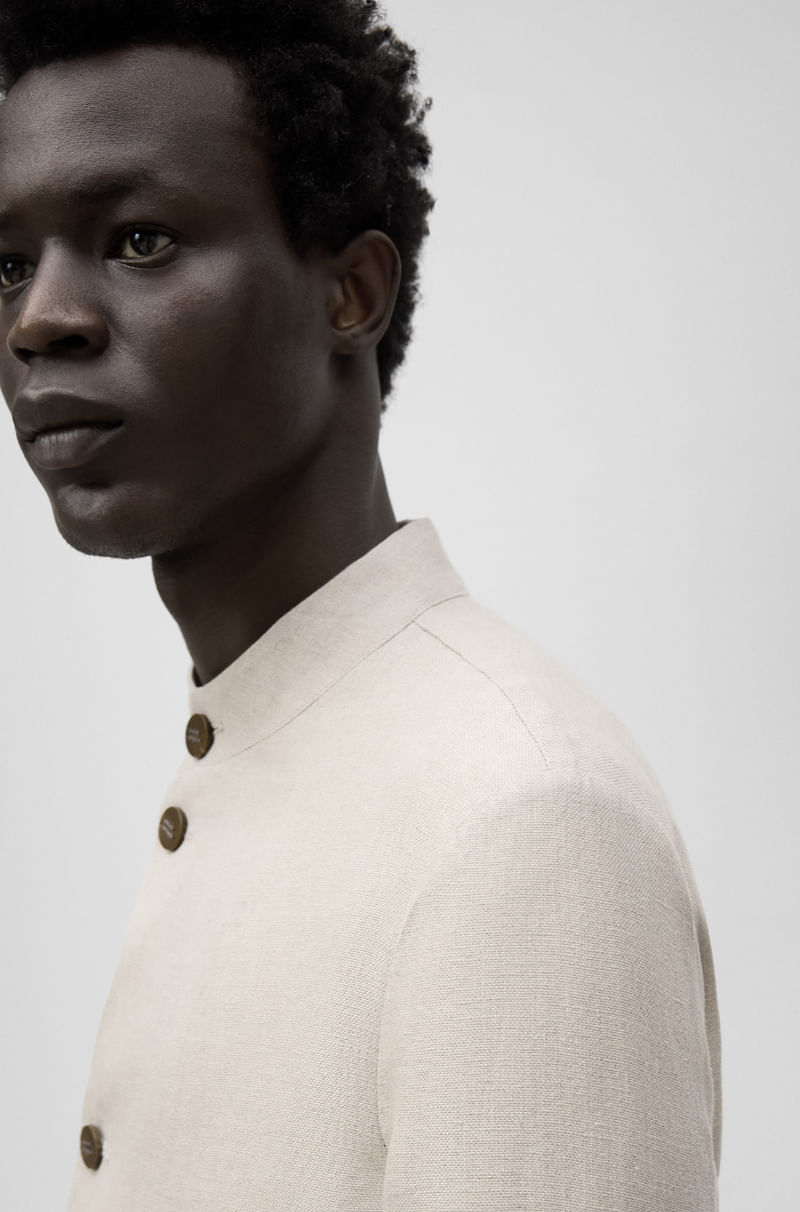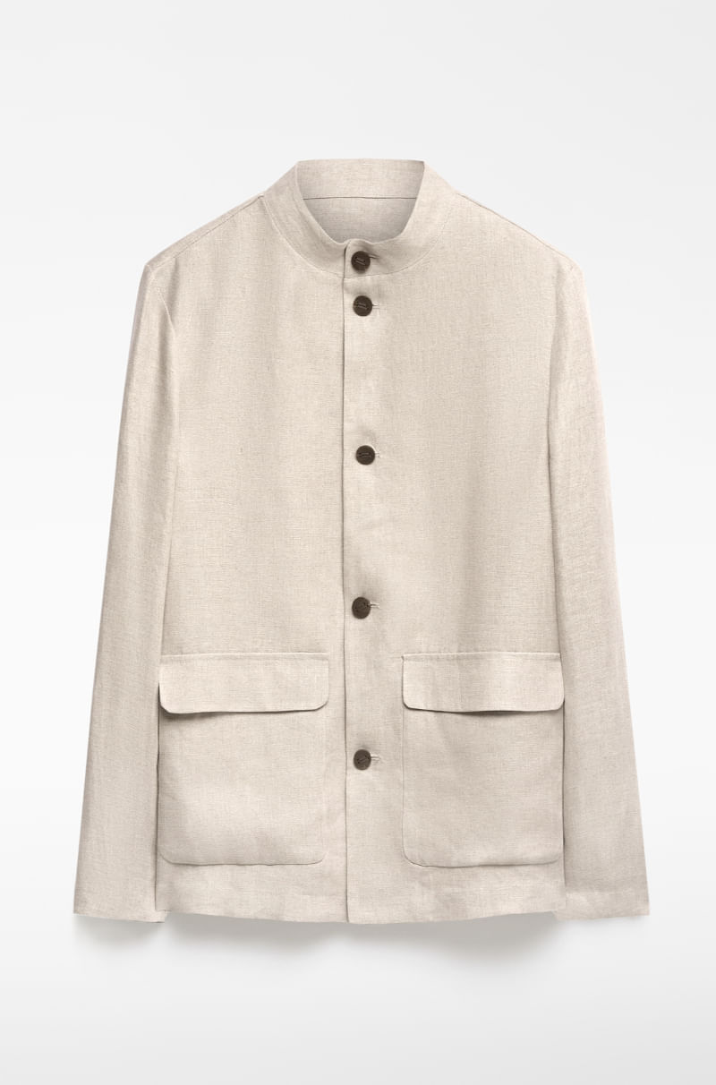 Sobrecamisa lino hombre. Manga larga. Cuello mao. Botonadura central. Bolsillos de plastrón con solapa en delantero.