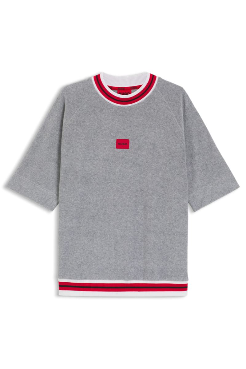 Esta sudadera relaxed fit, confeccionada en felpa de mezcla de algodón jaspeado, es una opción estupenda para estar en casa. Etiqueta con logo y rayas en contraste. Hombros caídos. Modelo de corte: relaxed fit