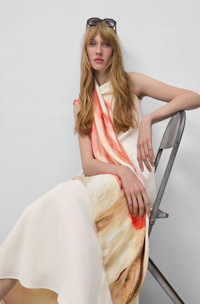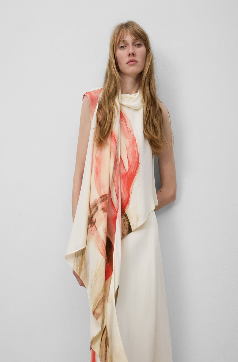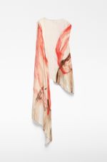 Top estampado viscosa responsable mujer. Manga sisa. Bajo asimétrico. Pañuelo en cuello para posicionar sobre hombro.