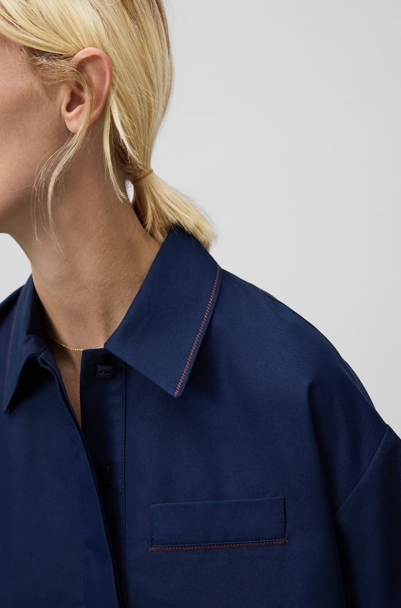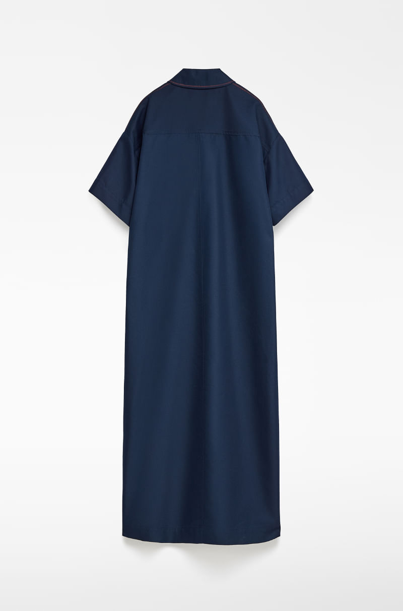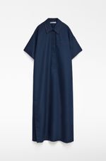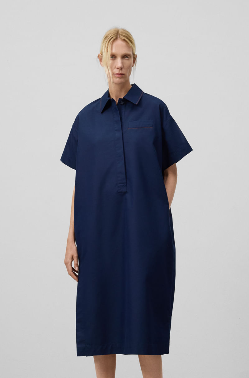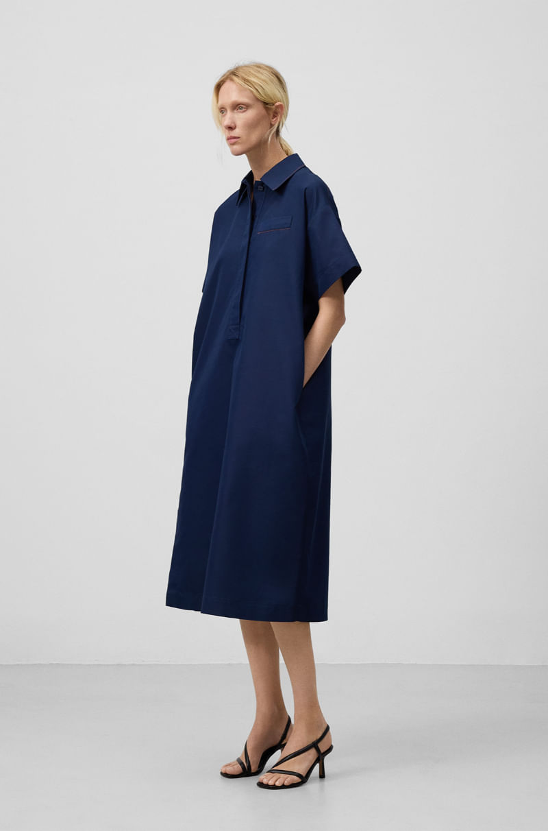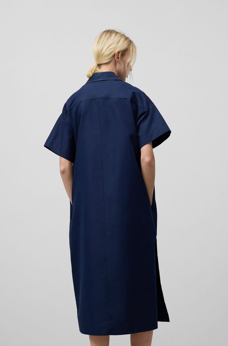Vestido camisero recto azul marino mujer. Cuello solapa con cierre botón. Manga corta. Bolsillo de vivo en pecho. Abertura lateral. Canesú en espalda. Pespuntes decorativos a contraste.