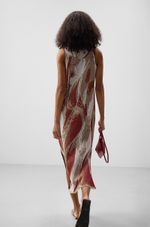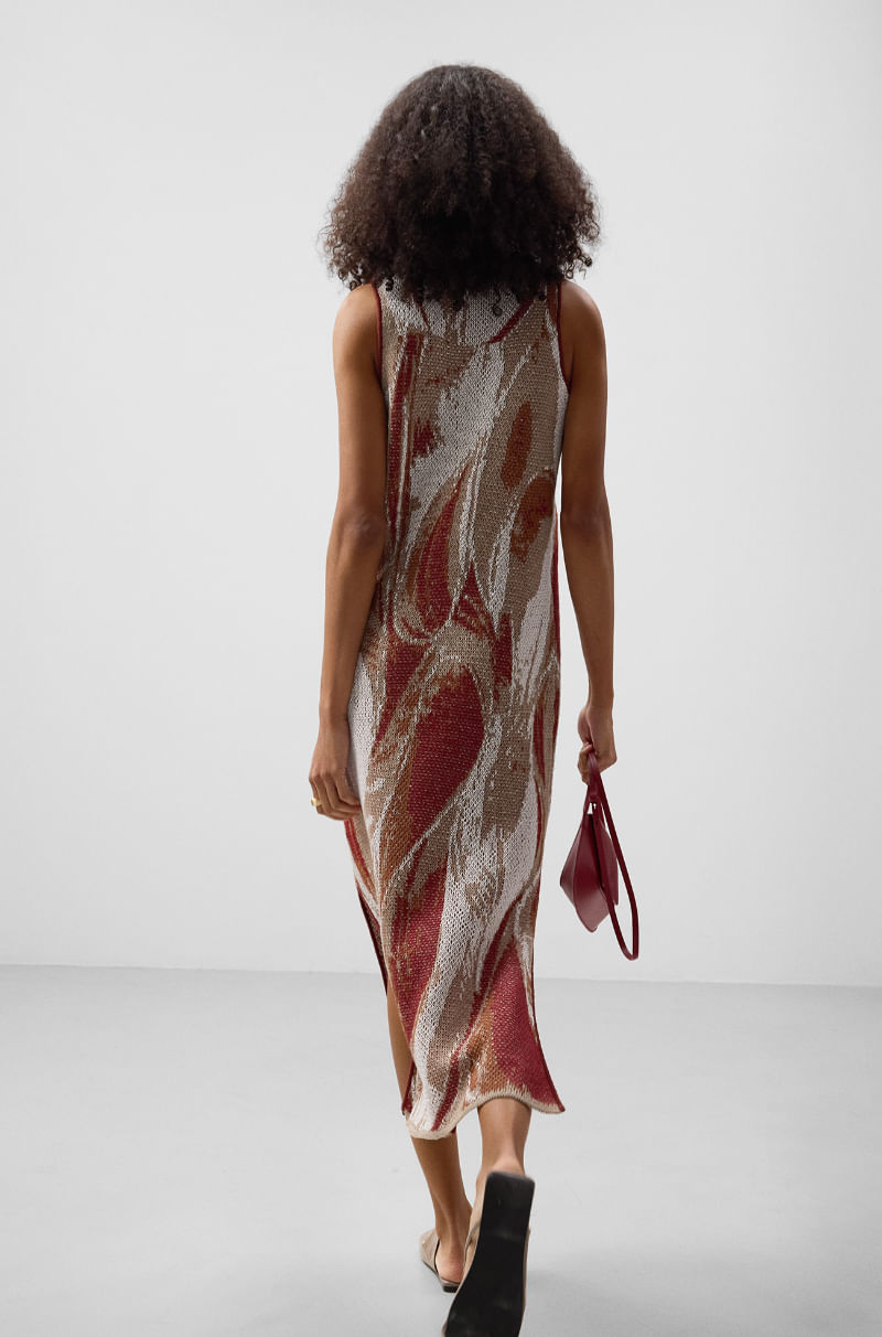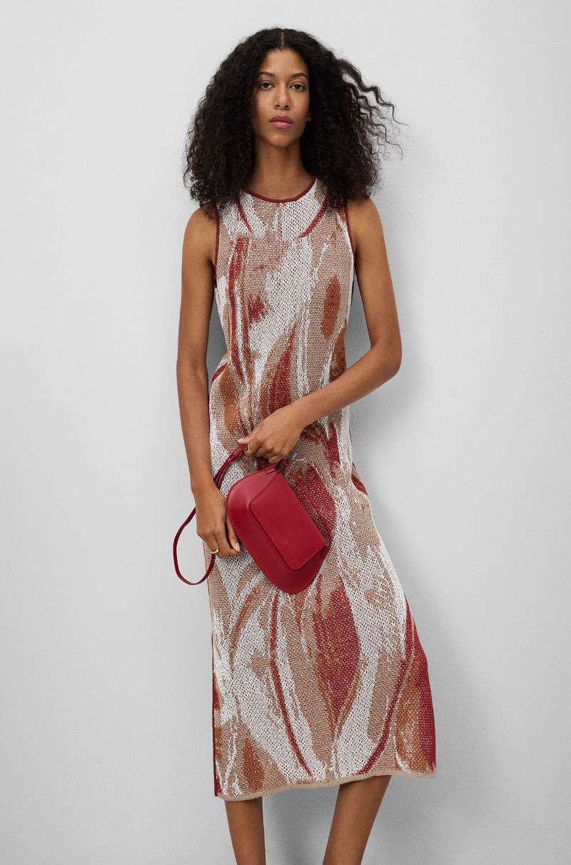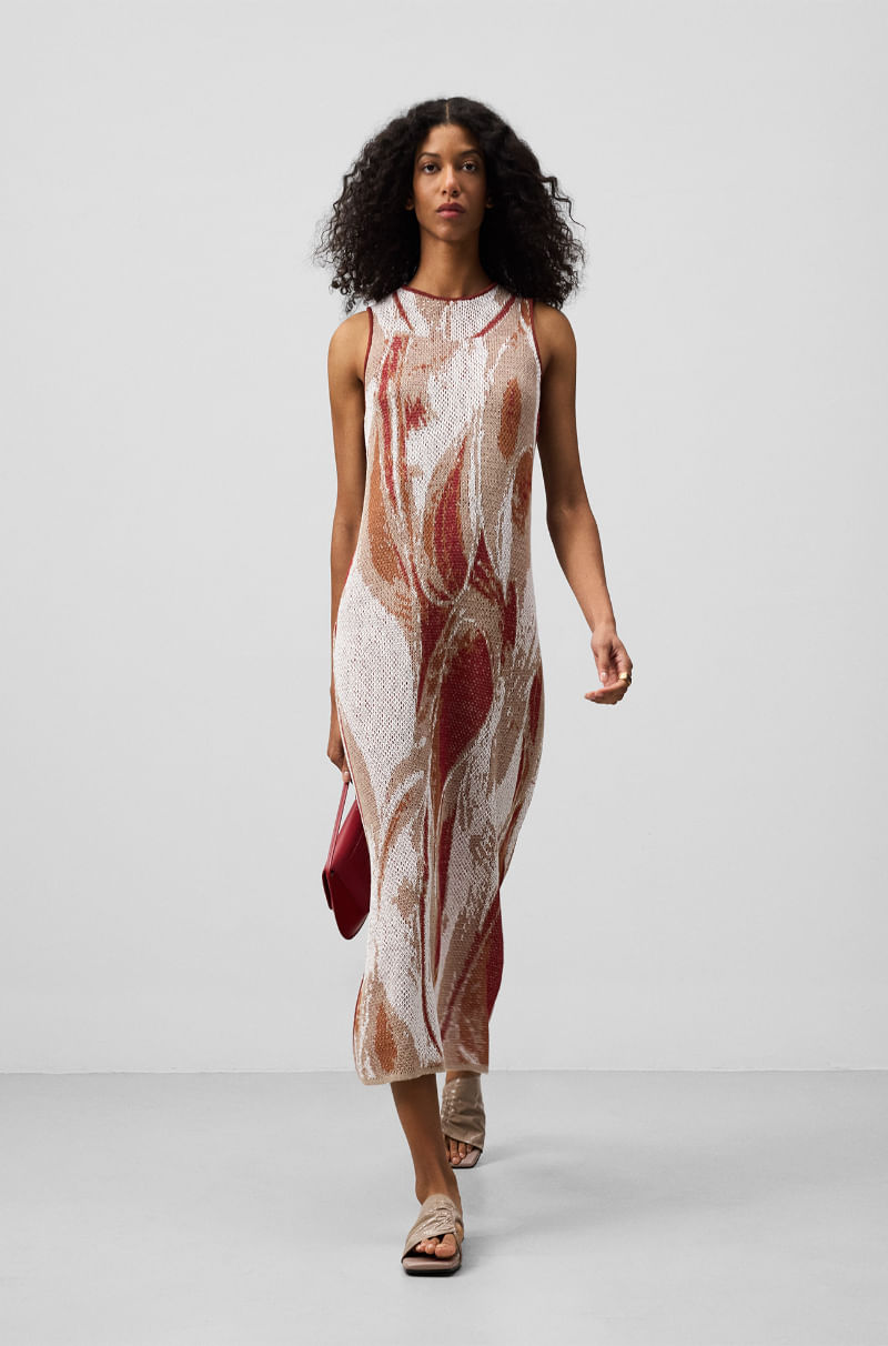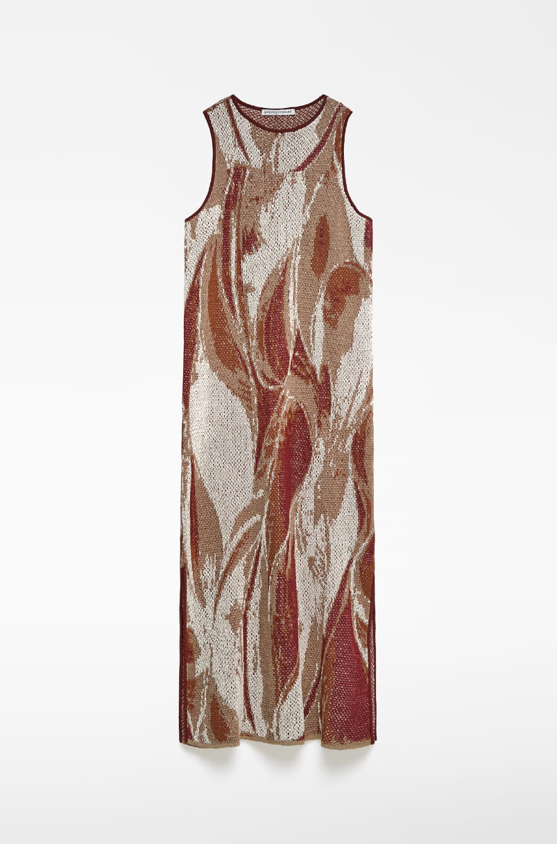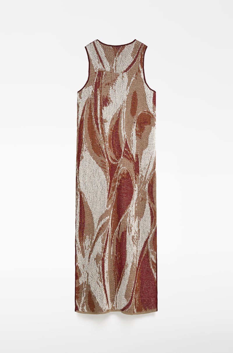 Vestido jacquard con lino mujer. Línea recta. Cuello caja. Manga sisa.