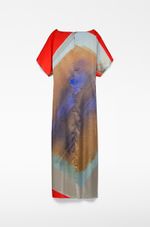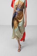 Vestido midi estampado mujer. Cuello barco. Manga corta japonesa. Nudo drapeado en delantero. Cierre lágrima con botón en espalda.