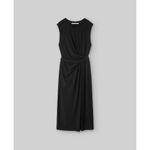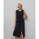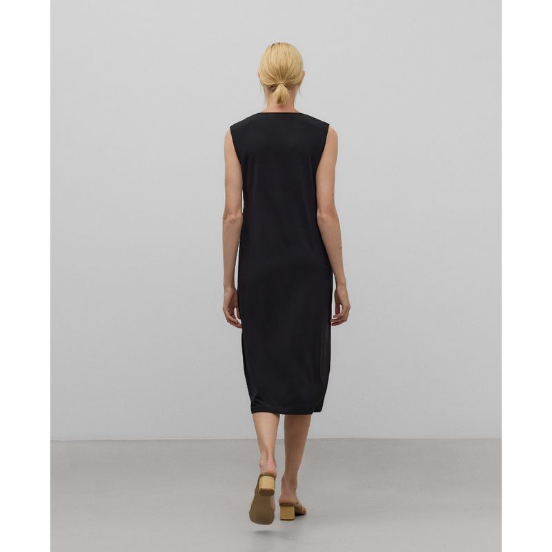 Vestido midi negro mujer. Cuello caja. Manga sisa. Gesto para anudar. poliester 94% elastano 6%