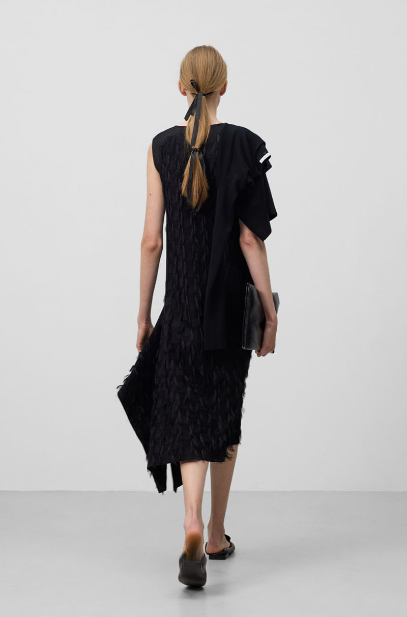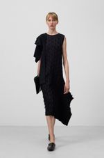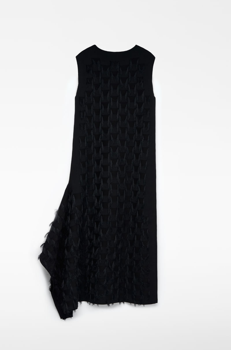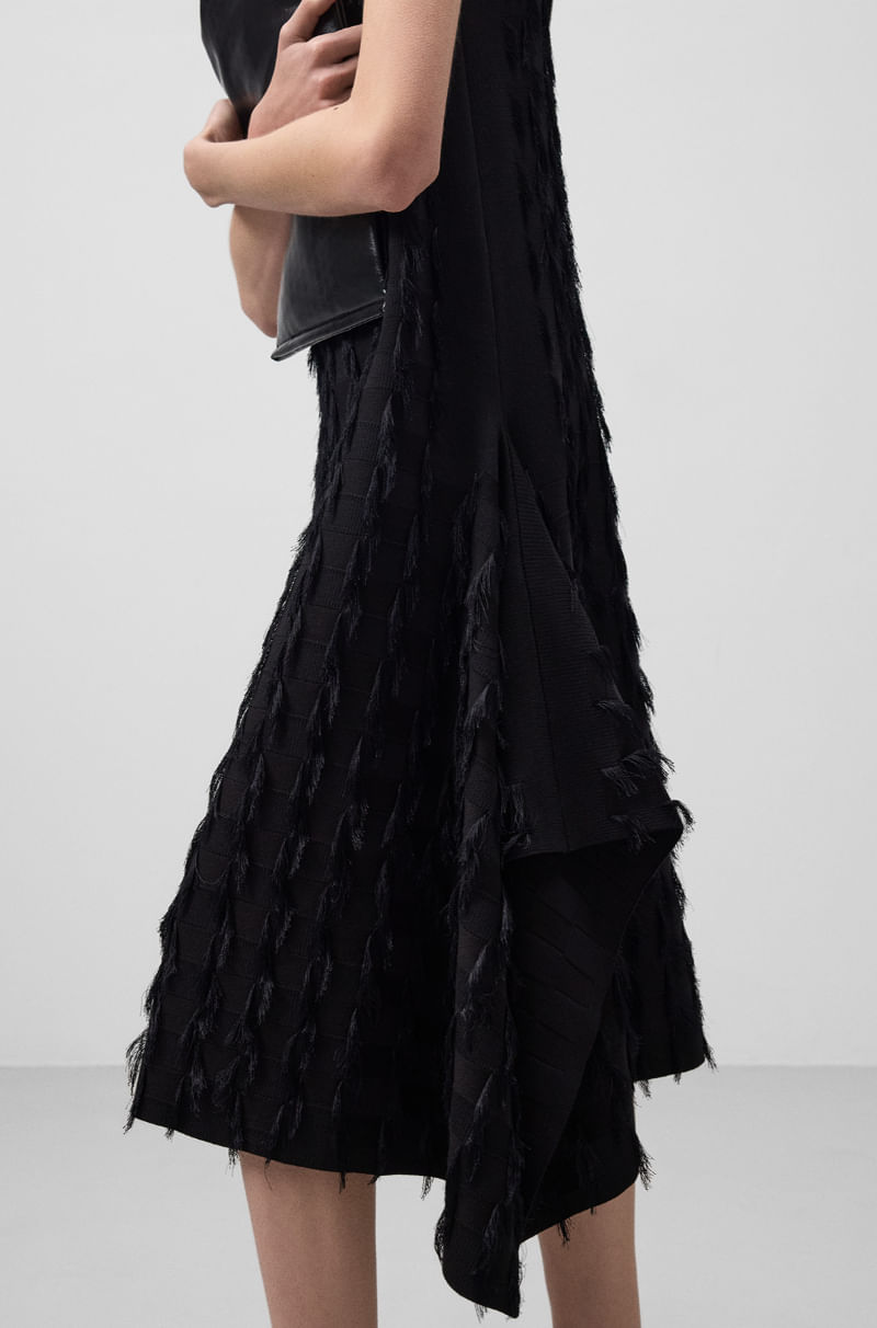 Vestido midi en punto jacquard mujer. Trabajo de flecos posicionados. Cuello caja. Manga sisa. Godet lateral.
