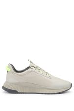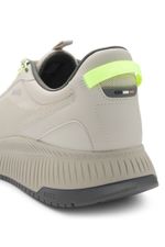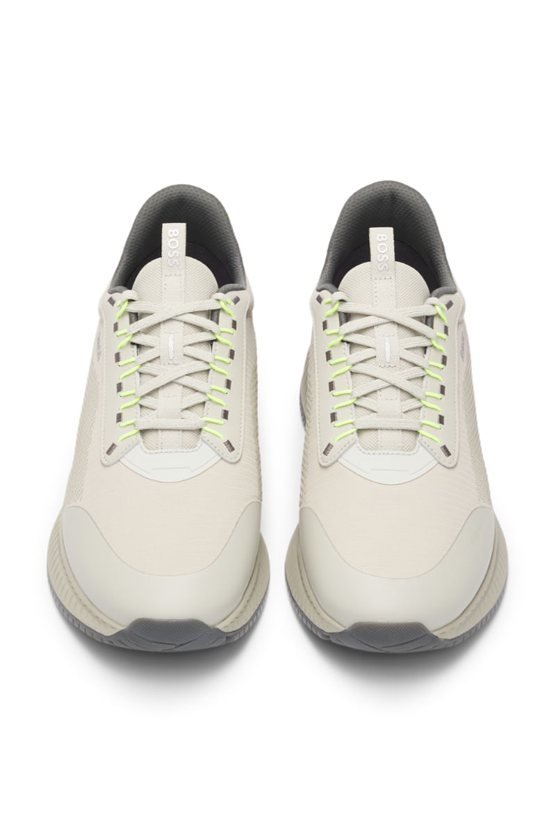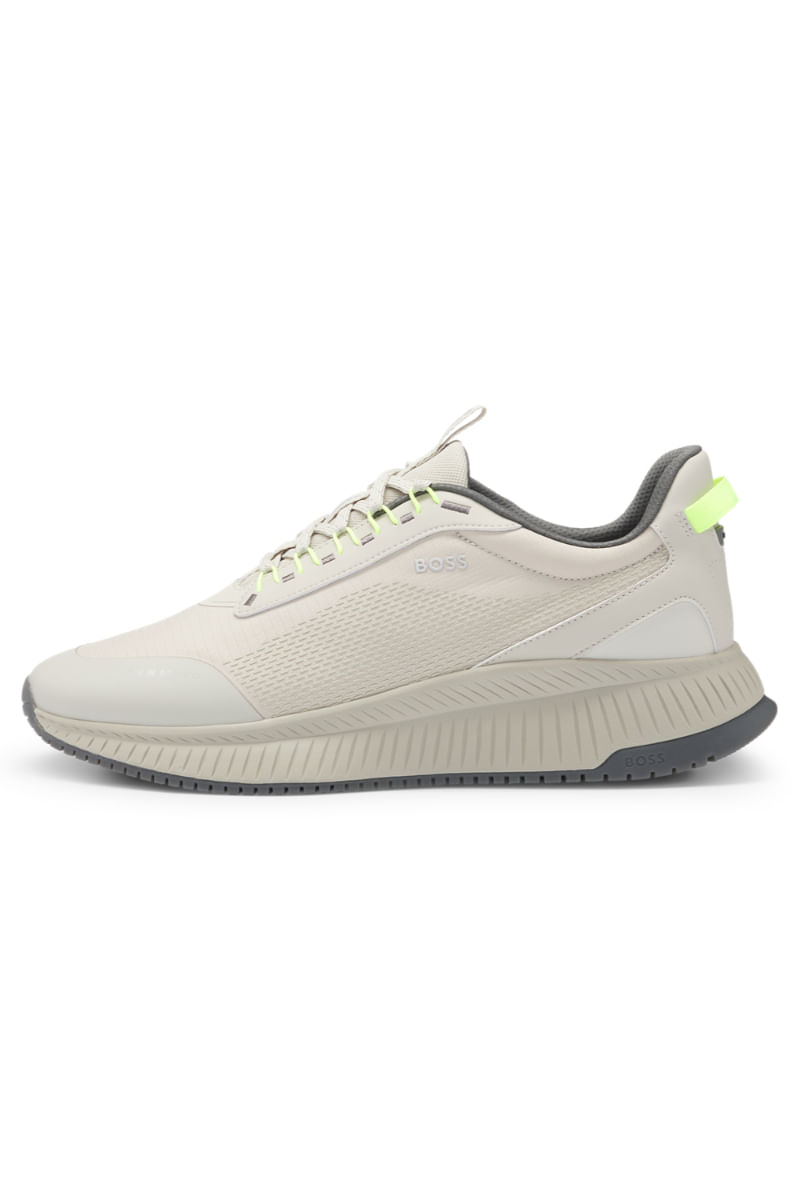 Unas modernas deportivas TTNM EVO BOSS con una llamativa suela estriada. Este par ultraligero presenta empeines termosellados y detalles de la marca.